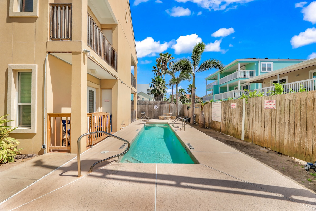 NEWLY UPDATED! ENJOY a 3'rd floor walk-up & summer fireworks outside this space with a shared pool. No need for driving! 3 min walk to beach! 5 min to entertainment district with bars, eateries and clubs. 1/2 block to free bus service to anywhere on the island/Port Isabel! NEW LAUNDRY CENTER IN MASTER! NEWLY RENOVATED King bed in master with en-suite bathroom, 2'nd bdr with 2 full-sized beds. Queen memory foam sofa/sleeper. * NOTE - ONLY FAMILIES DURING SPRING BREAK/SEMANA SANTA