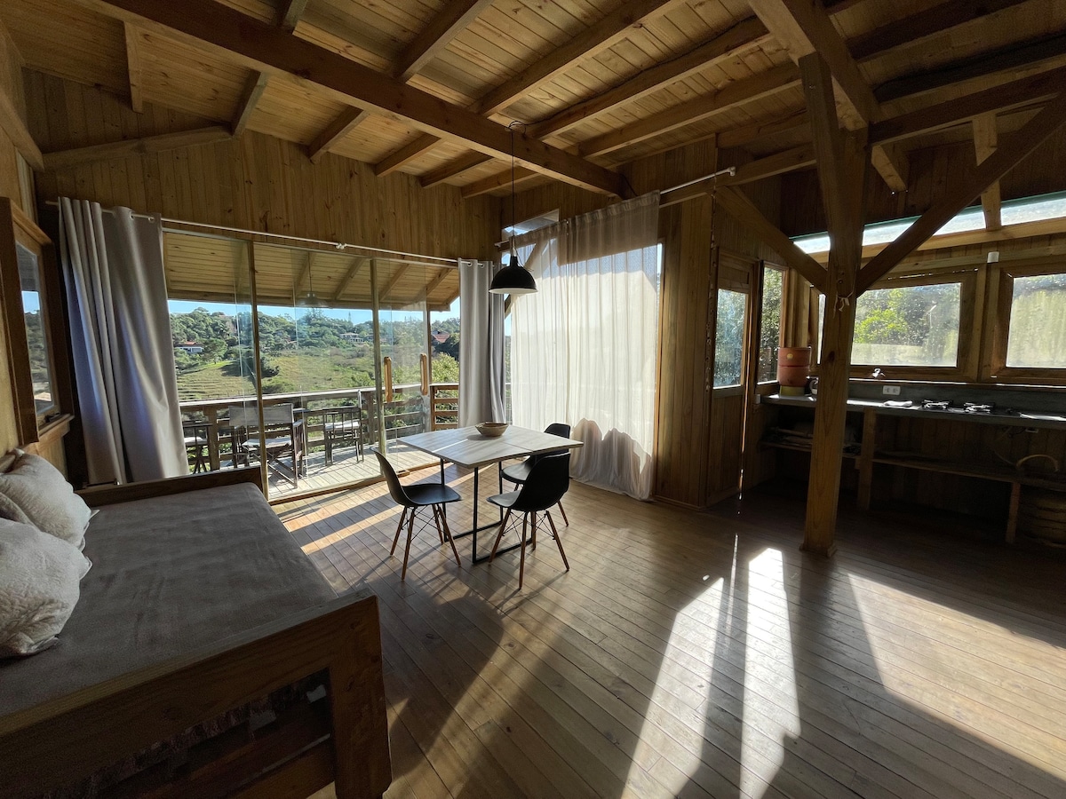 Chalet de madera, con una cama doble en el entrepiso y una cama doble en la sala de estar con dos colchones individuales, cocina completa, baño, sala de estar, balcón en forma de L con hamaca y parrilla, aire acondicionado 22K, Wifi 60MB con fibra óptica, 32 smart TV, microondas, sandwichera, licuadora, cafetera eléctrica, garaje y una amplia vista al mar y a la sierra.