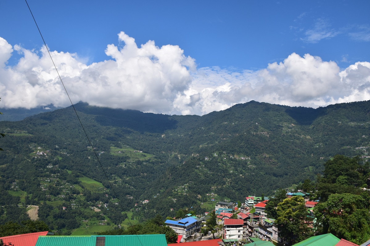 El apartamento tiene grandes ventanas francesas de madera que se abren a una vista impresionante del valle del río Ranka y las montañas Teenjurey. La sensación es mágica desde el apartamento y el balcón exterior. El apartamento es un refugio ideal con sabor a Sikkimese, perfecto para una familia o un grupo pequeño con una gestión de experiencia internacional que se ocupa de tu comodidad y privacidad. Está bien comunicado con las atracciones turísticas y a 10-15 minutos en taxi de MG Marg, el popular centro comercial peatonal.
