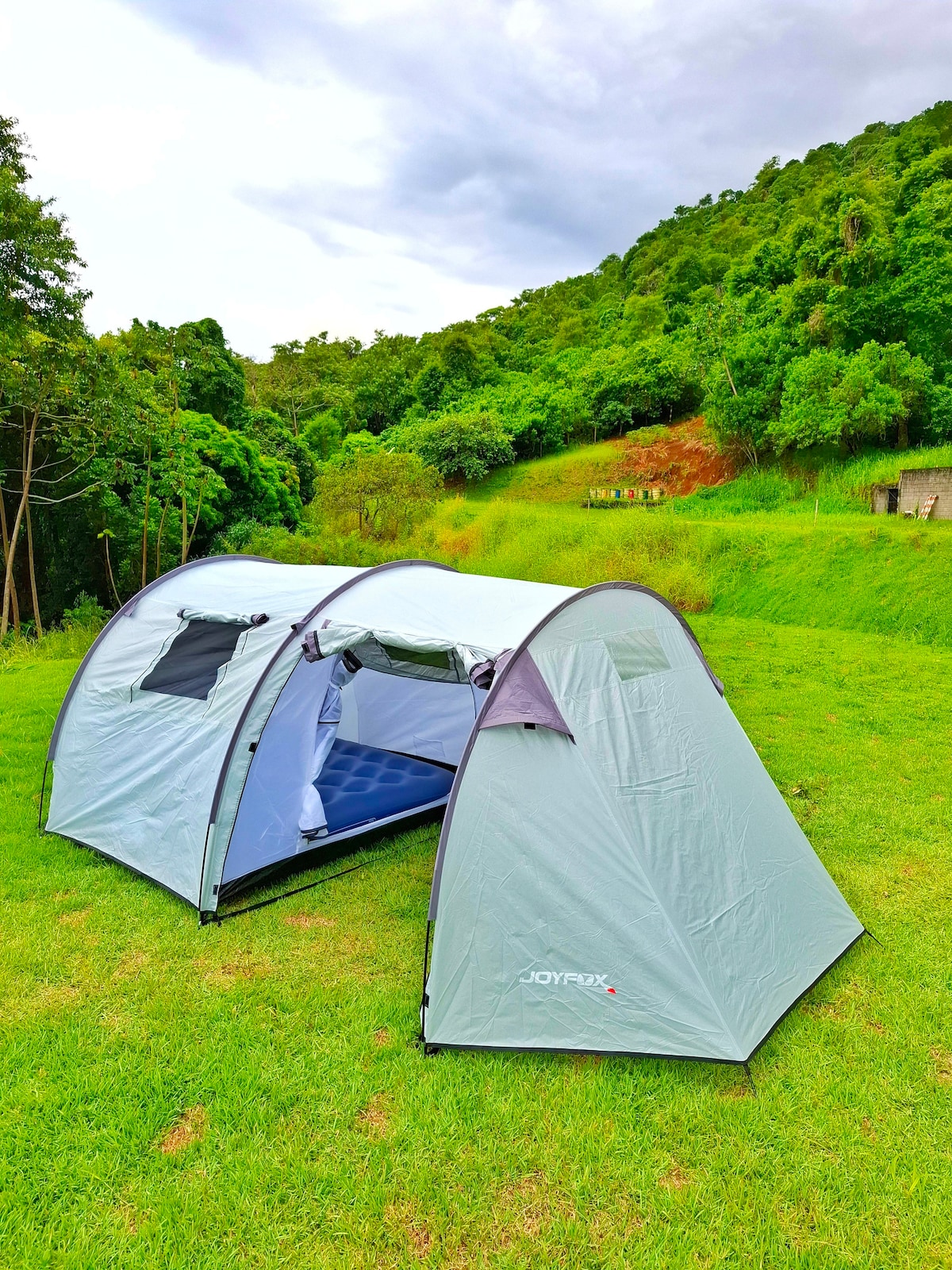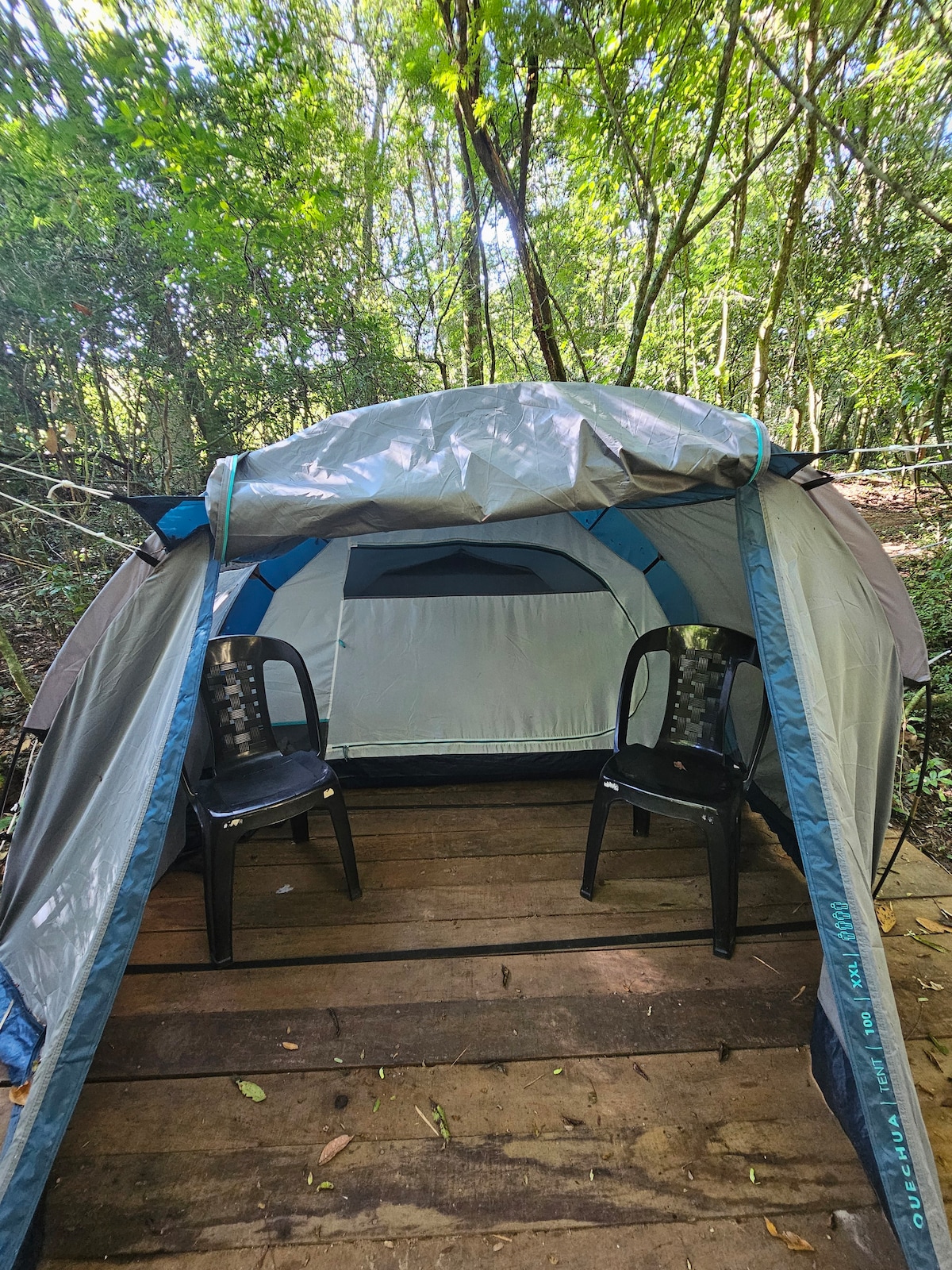 Uma experiência incrível e diferente de dormir e acordar em meio a uma abundante Natureza e seus sons, ao lado de nosso paradisíaco rio de pedras. Nossa estrutura inclui uma barraca Quechua completa, em um tablado suspenso, com vista para o rio. Além de possuir banheiro, cozinha e restaurante nas áreas superiores de nossa ecofazenda. O Bosque onde está montada essa barraca, fica em um local fica mais isolado do restante da fazenda (200mt).