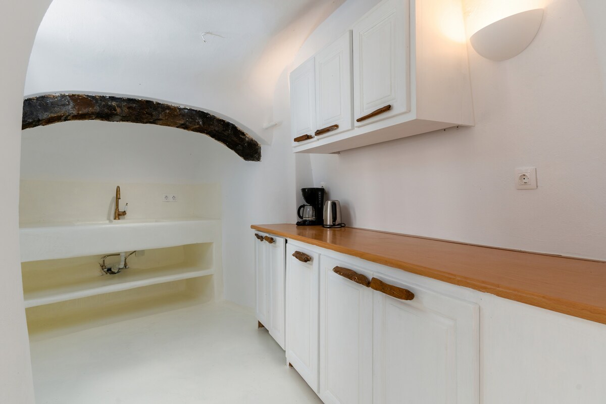 La suite cueva es moderna y elegante con un diseño que combina la arquitectura tradicional con el lujo contemporáneo. Esta suite de estilo cueva tiene una cama doble tamaño queen, una terraza privada y una bañera de hidromasaje, una pequeña cocina y un hermoso baño con ducha incorporada. Disfruta de la puesta de sol desde la terraza privada y el jacuzzi. Todas las habitaciones tienen acceso al patio del hotel con piscina común con vistas a la Caldera, el mar Egeo y la puesta de sol.