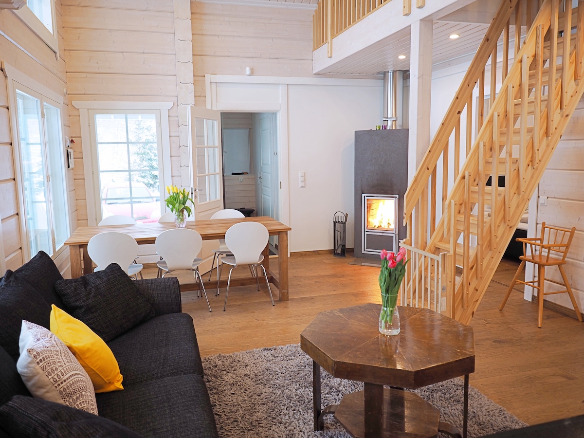 ¡Bienvenido a relajarte en una casa de campo moderna recién terminada con impresionantes vistas desde sus grandes ventanales sobre los campos! En el bosque alrededor de la cabaña, puedes ir de excursión, setas y recoger bayas, y en un kilómetro se encuentra el pintoresco lago Gölen. La cabaña se encuentra cerca de la herrería de Billnäs, y el Fiskars Village, con sus restaurantes y boutiques, también está a poca distancia en bicicleta. Una sauna tradicional de leña, de libre acceso para los inquilinos, ofrece vapor profundo y húmedo.