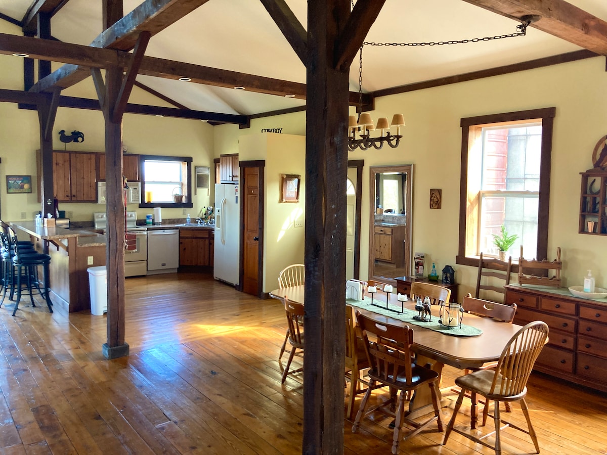 El granero de 1938 está ubicado en ❤ Covered Bridge Country en el condado de Parke. Te encantará el encanto rústico de este granero de heno reconvertido construido en 1938. Ven a relajarte junto a la fogata o explora nuestros muchos puentes cubiertos y los parques estatales locales. La granja también alberga Henry 's Market, un jardín de mercado que ofrece carne y verduras frescas, lo que hace que el verano sea un excelente momento para visitar. Por favor, ten EN cuenta que NO hay WIFI, NO hay CABLE. Tenemos una selección de DVD. Servicio celular limitado, AT&T funciona mejor.