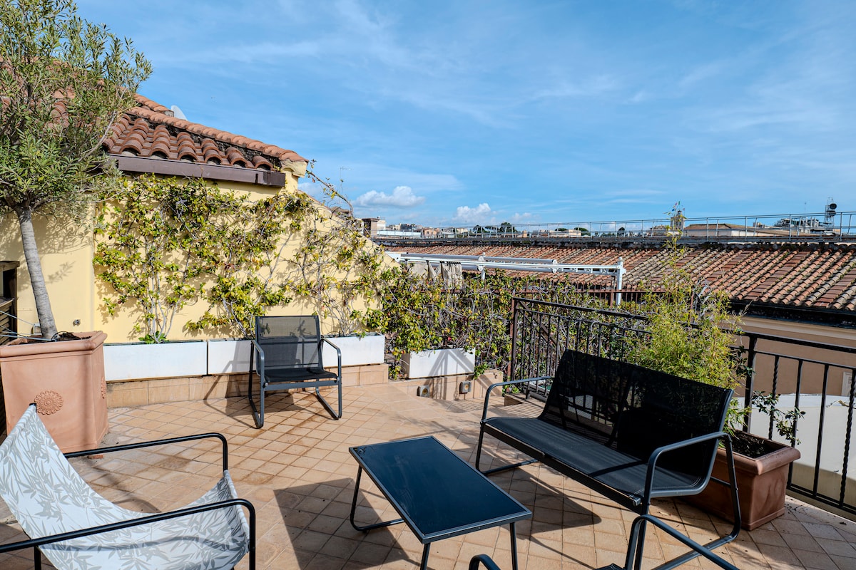 En la terraza de este tesoro único de una propiedad ubicada en el último piso de un edificio muy especial del centro histórico de Roma, se deben disfrutar de unas vistas fascinantes y amplias de todos los monumentos de Roma y de los tejados de baldosas de terracota. Este apartamento es conocido por nosotros como la suite de luna de miel, ya que es perfecta para una pareja y tiene todos los ingredientes para una estancia romántica en la ciudad eterna.