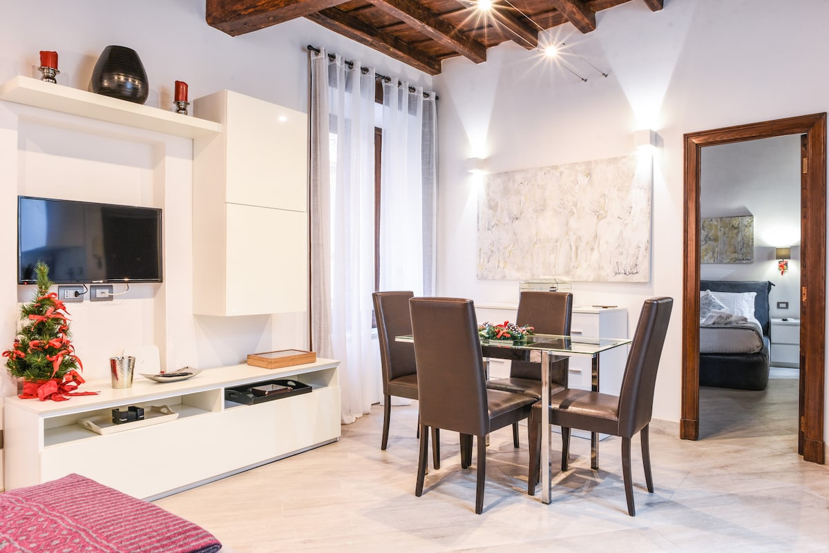 Delizioso e confortevole monolocale situato nel centro storico di Roma in un palazzo d’epoca a pochi metri dal Pantheon, completamente ristrutturato si trova al quarto piano senza ascensore. Arredato con stile, è caratterizzato dallo splendido soffitto in travi in legno, pavimenti in parquet e camino in marmo. Affacciandosi dal piccolo balcone si può godere della vista del caratteristico vicolo e dei tetti di Roma. La posizione è strategica ed ideale per visitare a piedi le meraviglie di Roma.