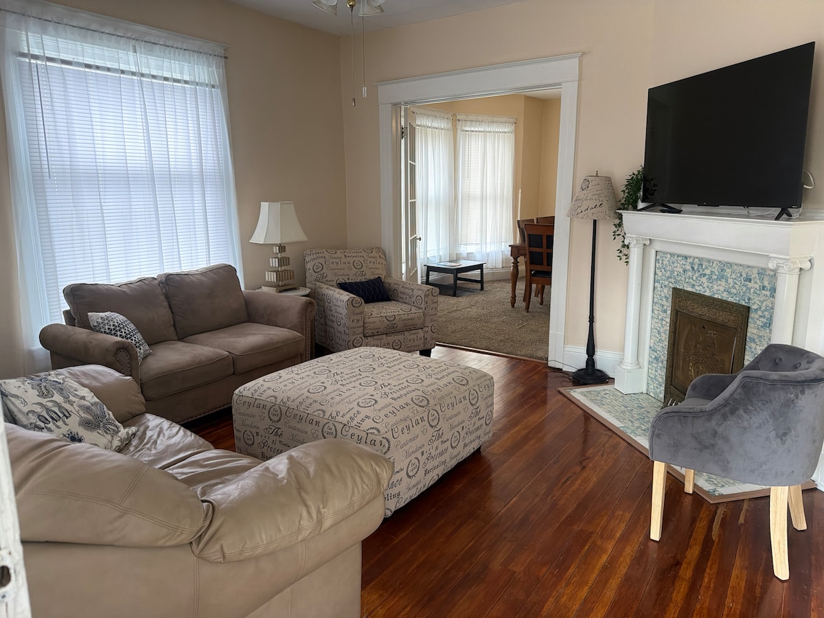 Unwind in this extra-spacious, quiet Springfield home just minutes from downtown, hospitals, and Lincoln sites. Enjoy a huge, fully stocked kitchen with a large island, espresso + drip coffee, and a cozy living room with a 65” 4K TV. Upstairs features a queen bedroom with a 55” 4K TV, a relaxing Jacuzzi bath, and a dedicated office nook. Keypad self check-in, free parking, and a fenced yard.