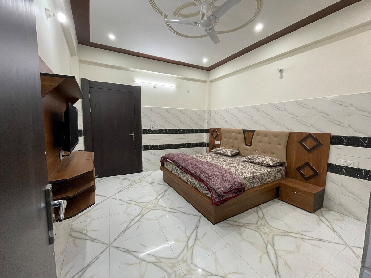 Peaceful modern stay within walking distance of Prem Mandir and Iskcon Temple. Comfortable king-size bed, AC, WiFi, and clean attached bathroom. Perfect for families, couples, and pilgrims seeking comfort near the temples.