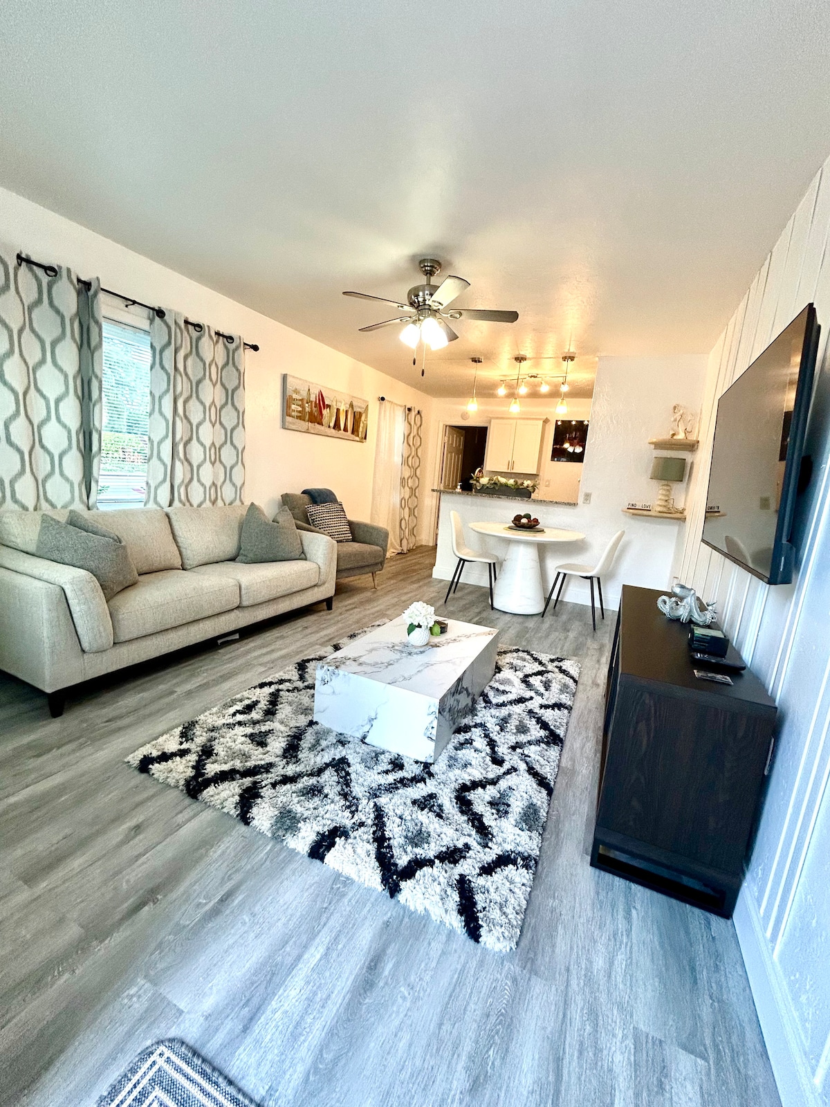 La casa cuenta con un patio de piscina cubierto y una zona de comedor y descanso al aire libre, ¡perfecta para relajarse después de la playa o descansar todo el día en casa! Todas las habitaciones tienen colchones de espuma viscoelástica que garantizan un buen descanso nocturno. La sala de estar cuenta con un televisor inteligente de 75 pulgadas para transmitir todos tus programas favoritos o ver las noticias. La cocina está totalmente equipada para que puedas preparar una buena comida en casa durante tu estancia, así como lavadora y secadora en la lavandería.