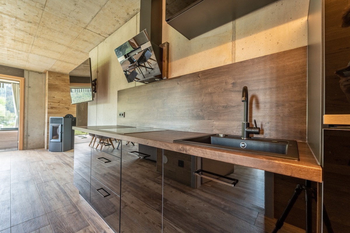 Nuestro apartamento está construido en 2016 y nos encantó diseñar las habitaciones, el equipamiento y la decoración. Se encuentra en la planta baja de nuestra casa y tiene una entrada independiente, una habitación adicional para esquís/botas de montaña, una entrada adicional y una conexión directa con la terraza y el jardín. El apartamento está totalmente equipado y la vista a las hermosas montañas que te rodean se puede disfrutar sentado en el sofá :) Solo tienes que probar y sentir la sensación "hogareña" en nuestra casa...