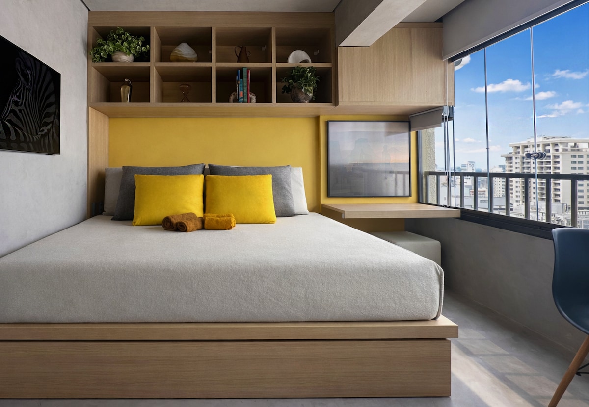 Un espacio único. ¡Vive una verdadera experiencia paulistana! Piso de 44 m2, 1 dormitorio con cama doble (ventana resistente al ruido), sala de estar con TV de 65 pulgadas, wifi, cocina, apartamento nuevo y renovado, balcón, aparcamiento gratuito, cerca de varios centros comerciales, tiendas de comestibles, restaurantes fantásticos, en el barrio más moderno y famoso de São Paulo, cerca del metro (400 metros), hermosa vista de la Av. Paulista. Tiene capacidad para 3 personas (1 persona en el sofá cama de la sala de estar). Recepción 24 horas.