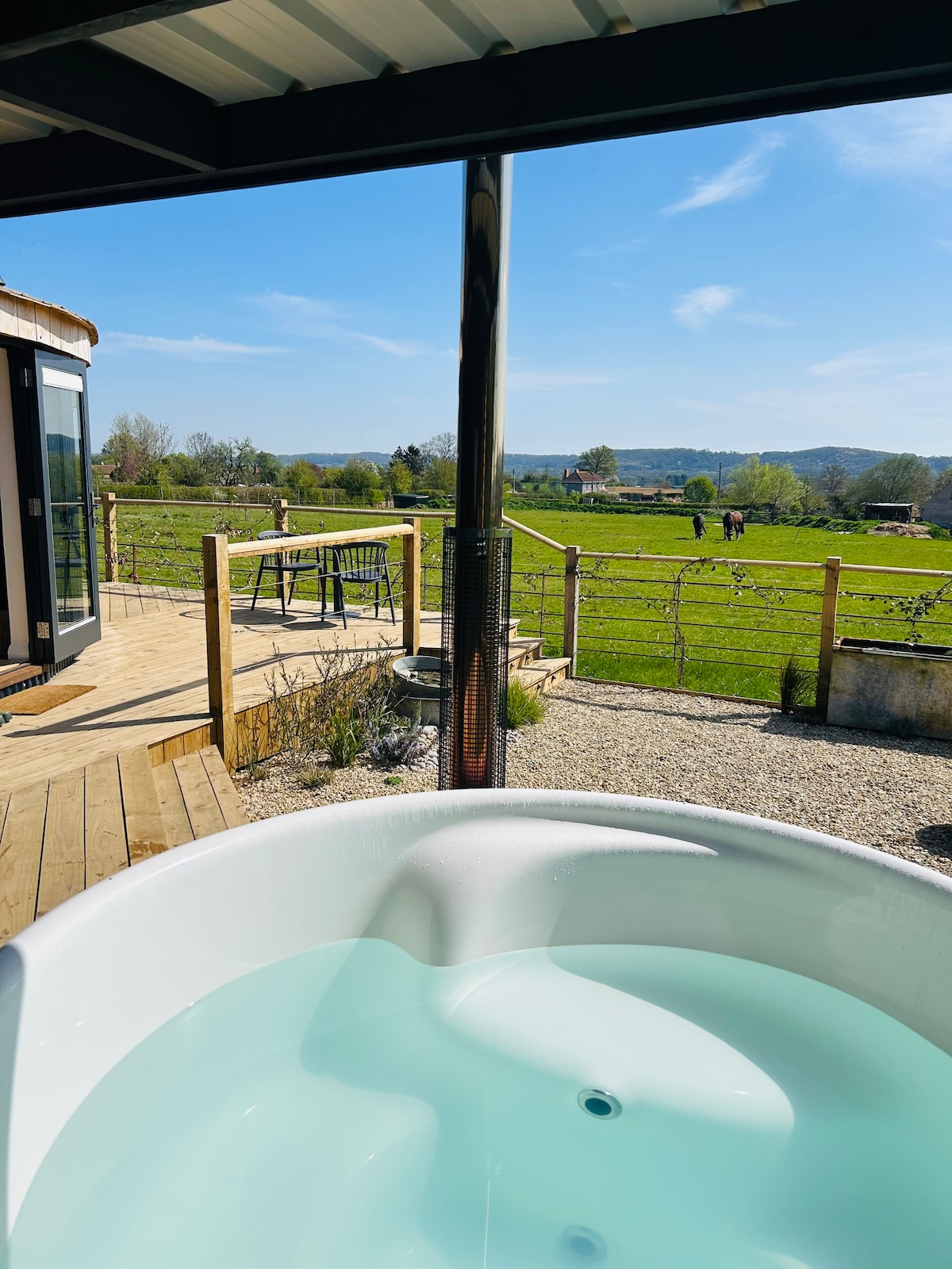 A bespoke, luxury roundhouse, with log fired Skarsguard hot tub & stunning views of the Blackdown Hills and surrounds. Nestled above the Somerset Levels. The Good Life’s roundhouse is the perfect place to get away from it all and enjoy some quiet time in the country. Come for a romantic getaway, just the two of you, unwind & destress, with luxurious and private surroundings.