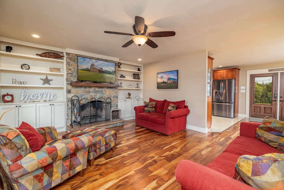 Nuestra granja recientemente renovada se encuentra en 80 acres de tierra, con vistas a dos estanques que están completamente abastecidos con peces para la pesca. Nuestra casa de dos pisos y concepto abierto ofrece un amplio espacio para un máximo de 9 personas. Disfrutá de la planta baja con dos salas de estar, una cocina completa y dos baños completos. La planta baja tiene dos dormitorios (3 camas). El piso de arriba de la casa solo se abre cuando se reservan más de 5 huéspedes (se aplican tarifas adicionales). El piso de arriba tiene 2 dormitorios adicionales y un baño.