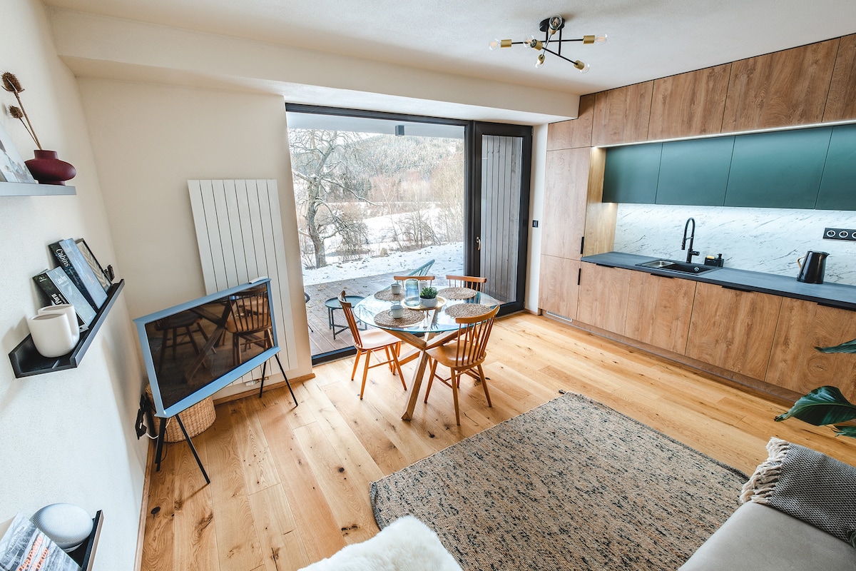 Moderně zařízení a kompletně vybavený apartmán v resortu s wellness, bazénem, fitness a dalšími možnostmi aktivit. Součástí apartmánu je oddělená ložnice s manželskou postelí, moderní koupelna s pračkou a sušičkou, komora a balkón s posezením a výhledem do přírody. Součástí obývacího pokoje je i elektrický krb a smart TV. K dispozici je samozřejmě Wifi zdarma. Apartmán má vlastní kompletně vybavenou kuchyňskou linku se vším co můžete potřebovat.