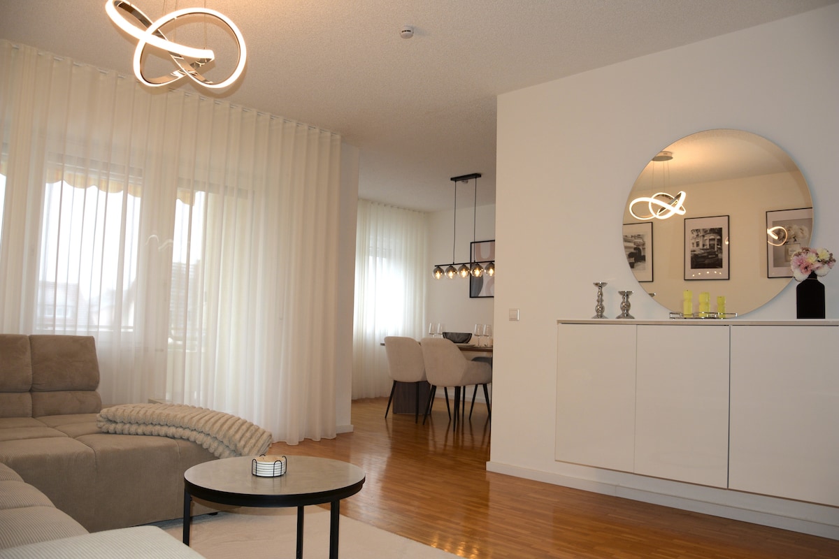 ¡Bienvenido a nuestro elegante apartamento de 2,5 habitaciones en la planta superior recién amueblado y elegante en Eggingen! La amplia sala de estar con TV inteligente y wifi (incl. Netflix UHD) te invita a relajarte. La cocina totalmente equipada tiene todo lo necesario para preparar platos favoritos. Un dormitorio con una cama de sombreado garantiza una noche de sueño bueno y relajante. La frontera suiza está a solo 5 minutos, hay un gran restaurante en el mismo edificio. ¿Qué más se puede pedir?