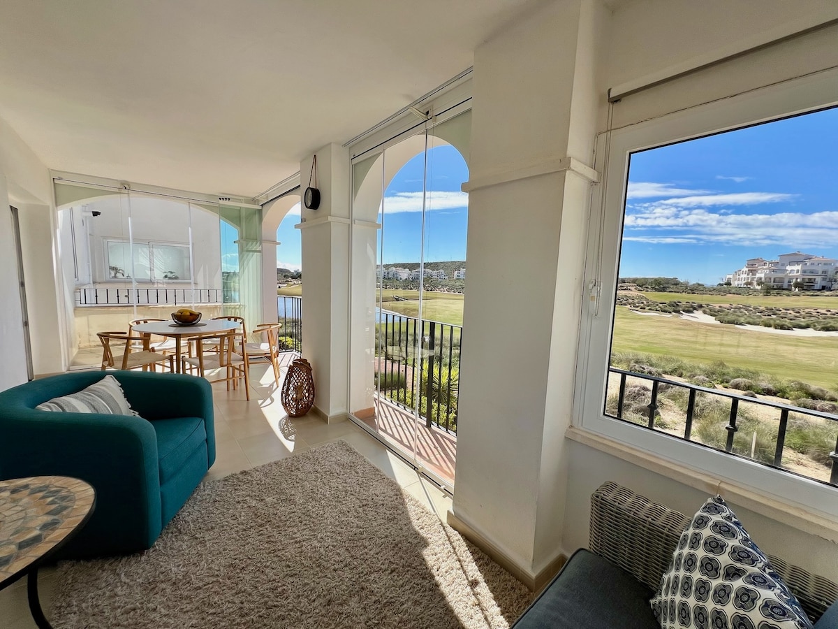 Your sunny escape at Casa Sofinata — terrace apartment with pool and golf views in Hacienda Riquelme Resort ✨ Bright apartment with a spacious terrace for relaxing and outdoor dining 🌴 Pool and golf views from the terrace 🍽️ Fully equipped kitchen (coffee machine, dishwasher, washing machine) 📶 Wi-Fi, Smart TV and air conditioning 💛 Ideal for couples and families 🏡 Secure resort with pools, restaurant, shop and playground 🌊 Beaches only 20 minutes by car, 15 min to Murcia