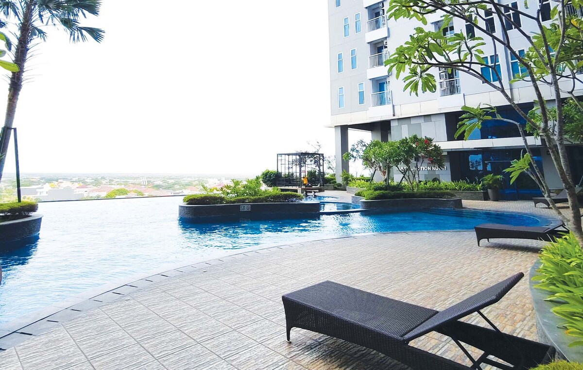 Relájate en este apartamento tranquilo y elegante, equipado con piscina infinita y gimnasio gratuito, ubicado en la parte superior del centro comercial Pakuwon City, con mucha variedad de comida a solo unos pasos de distancia. También lo mejor para tu estancia con Netflix gratuito. Excelente ubicación, a solo 30 minutos del aeropuerto y a 15 minutos del centro de la ciudad. Escuelas y atracciones cercanas Parque de Shanghai Calle comercial de San Diego San Antonio Shopping Street Galaxy Mall Universidad: Unair, ITS, Widya Mandala, Widya Kartika