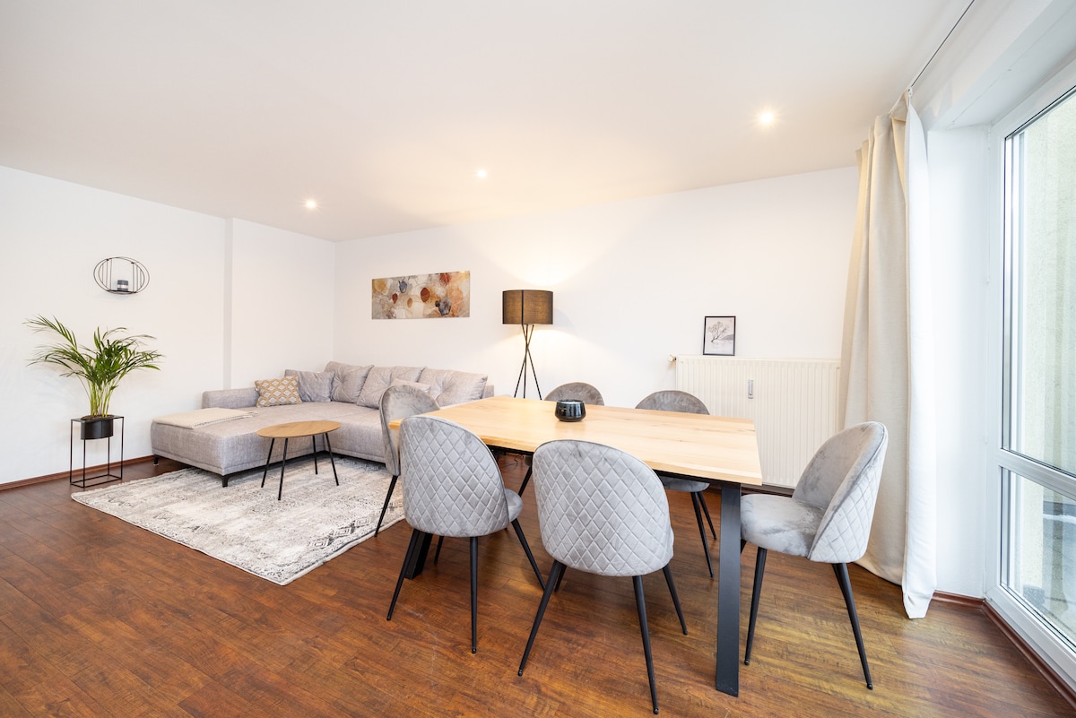 A two-bedroom apartment with a garden in Emmering, located near munich with 90 sqm. There is a bus stop 2 minutes away and the S-Bahn ride from the train station Fürstenfeldbruck to munich city takes about 30 minutes. It is perfect for big groups visiting beautiful Munich as well as the Bavarian uplands with castle Neuschwanstein! The spacious flat is providing ample room for up to 8 people. Free parking is available. Just a few minutes away, you will find beautiful nature and a bathing lake!