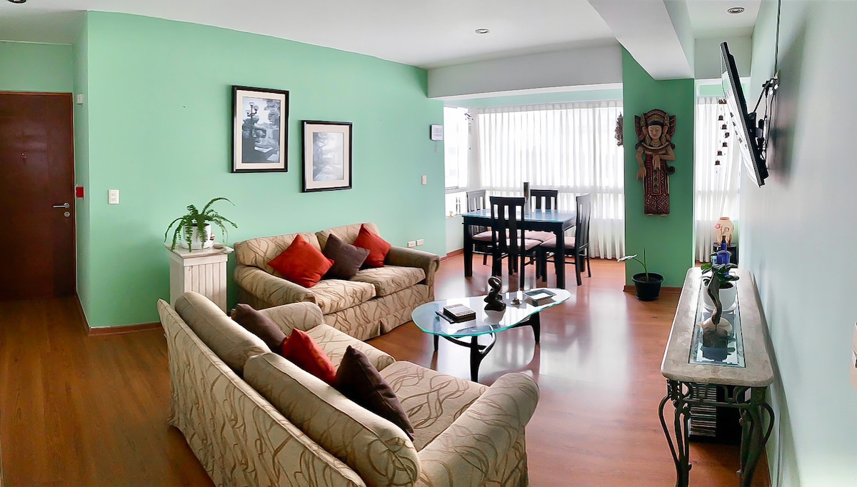 Disfruta de un apartamento cómodo y elegante, solo para ti, en la mejor zona de Lima!! En nuestro espacio encontrarás todo lo que necesitas para relajarte, para un viaje romántico, para una estadía en familia o para seguir trabajando. A solo unos minutos de "Lima Histórica" y del hermoso malecón de Miraflores. Puedes movilizarte en auto propio, en taxi o en transporte público! Muy cerca de áreas verdes, ciclovías, playas y de los mejores restaurantes de la ciudad!! Te esperamos!! :)