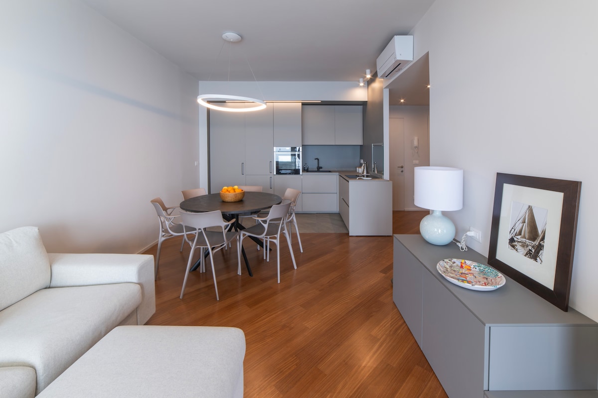 Apartamento en el centro, a 500 m del mar, cerca de la estación de tren y de la salida de la autopista. El apartamento está equipado con aire acondicionado y se distribuye de la siguiente manera: 2 dormitorios con una cama de matrimonio cada uno, entrada con mesa de comedor y sala de estar, cocina y baño.