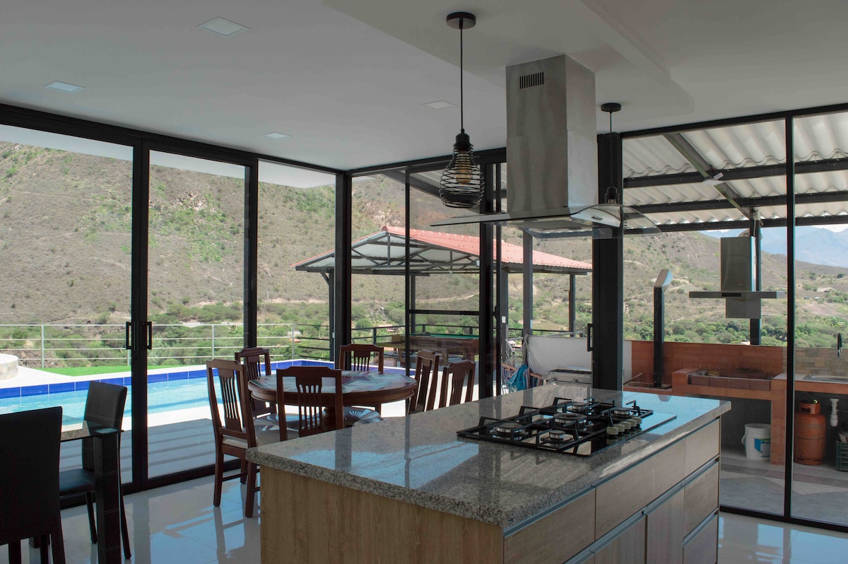 Un refugio sereno en medio de la tranquila campiña de Yunguilla, a solo una hora de Cuenca. Perfecto para relajarse en familia o reuniones, este refugio ofrece una bañera de hidromasaje, una refrescante piscina, amplias áreas al aire libre, una parrilla de barbacoa y una acogedora chimenea. El espacio de estar de concepto abierto combina a la perfección la sala de estar, la cocina y el comedor, con fácil acceso al patio adyacente ».