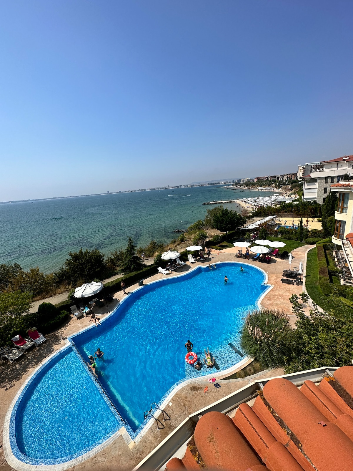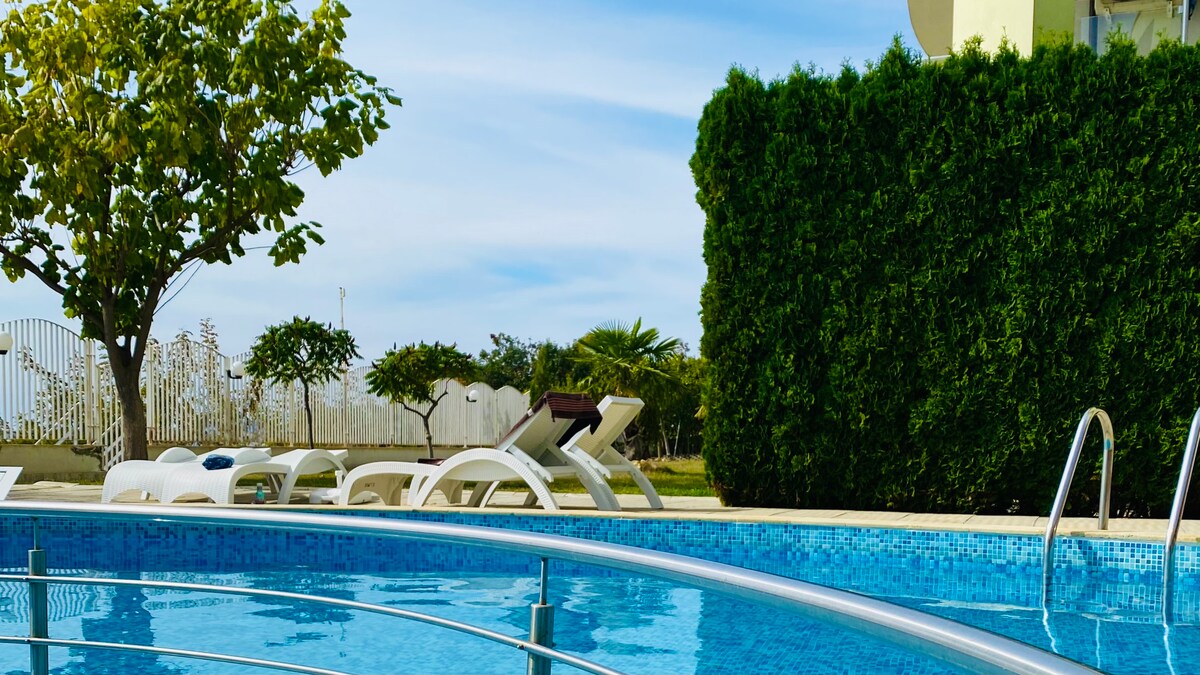 Este acogedor apartamento de 2 dormitorios ubicado en Saint Vlas, uno de los centros vacacionales del Mar Negro más populares de Bulgaria. El complejo se llama "Royal Bay Residence" y es un complejo de tipo cerrado. El lugar es tranquilo y silencioso, ubicado en una zona agradable, en primera línea junto a la playa. Royal Bay Residence se encuentra en la costa de Sveti Vlas, y tiene un magnífico jardín y una piscina con vistas al mar. No dudes en quedarte en mi acogedor apartamento de dos dormitorios (tres habitaciones), perfecto para familias.