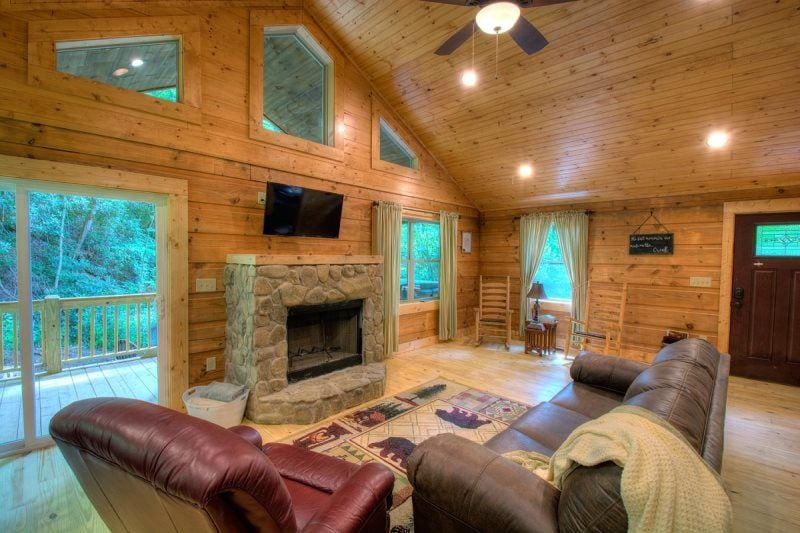 This is a beautiful, brand new log cabin. It is the perfect spot for a honeymoon or a romantic couple's retreat yet spacious enough to bring along 2 kids for a fun family getaway. This cabin sits tucked away right on the rushing creek. While the cabin itself is gorgeous, the outdoor area is it's own little paradise. With a fire pit by the creek, a spacious covered deck overlooking the water, porch rockers, and hot tub.