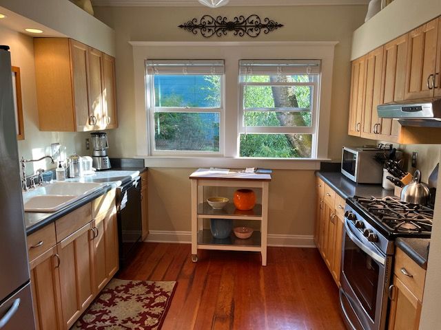 Un lugar enriquecedor con abundante luz, vistas al jardín y acceso a la mejor comida de Portland. «¡El mejor Airbnb en el que me he hospedado!» - Comentario frecuente de los huéspedes. - Premio del Instituto Americano de Arquitectos al diseñador Webster Wilson. - Servicios de lujo y accesorios europeos. - Tranquila calle arbolada del barrio de NoPo, a pocos minutos del centro de la ciudad. - Cocina totalmente equipada con café local fresco. - Comedor en interiores y al aire libre - Consulta los pies de foto para obtener más información. - Se admiten animales de servicio entrenados; no se admiten mascotas ni ESA.