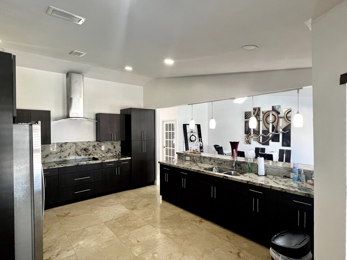 Casa renovada ideal para familias. 5 habitaciones y 4 baños completos. Piscina climatizada todo el año, mini golf, BBQ y swing. Diseño moderno con piano y 6 TVs. Parqueo gratis para 5 autos. Cerca del aeropuerto, playas y vida nocturna. (Capacidad: 1 king, 2 queen, 2 full, 2 twin y 2 sofá cama – full y queen / Hasta 16 huéspedes si son 2 por cama / Informar total de personas al anfitrion).(si traen perro siempre agregarla en la reserva(Si viajan con niños, avisar para instalar malla de piscina).