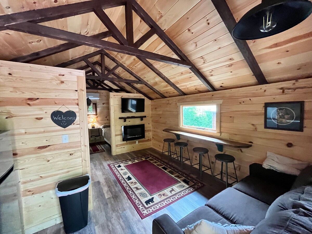¡Esta moderna cabaña de troncos es un gran estudio con todas las comodidades! Hay una cama tamaño king de aspecto muy importante, una hermosa decoración de montaña, un sofá plegable, sillas Adirondack para el porche y un columpio de porche a la antigua. Cocina completa, un baño, TV inteligente de 65 pulgadas con wifi rápido. Ubicado en el bosque con una GRAN bañera de hidromasaje, este es el lugar perfecto para celebrar o pasar la luna de miel. Ven con amigos. O sé egoísta y tráela solo para estar juntos. Bueno, también puedes traer al cachorro.