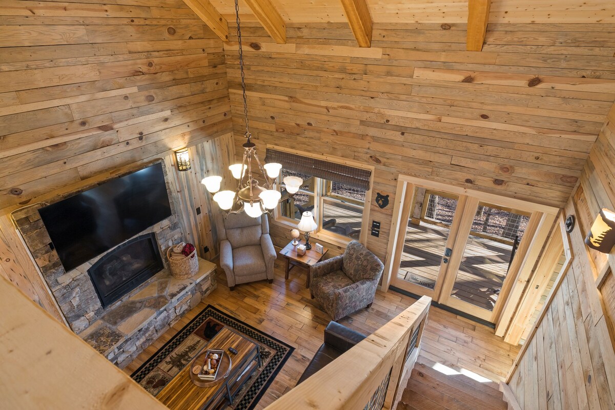 ¡El Red Shed A-Frame con una vista increíble de las Smoky Mountains ha sido renovado en un impresionante y único oasis privado! ¡A menos de 10 minutos de la ciudad! Refugio privado y aislado al aire libre que incluye un jacuzzi con cenador, bar, ducha al aire libre. Brasero, sillas de huevo, parrilla, deck grande, tetherball. ¡Nunca querrás irte! En el interior, un hermoso espacio de diseño de Parklin Interiors, una cocina nueva, una barra de café y mucho más. Loft grande con cama king con vista, y en la planta baja un segundo dormitorio acogedor con cama queen.