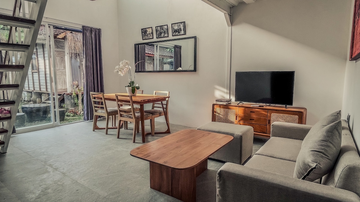 A room with Studio and Loft Bedroom Style. Good space for relax or work surrounding with local life of Balinese.15 minutes drive to famous Echo Beach Canggu or 20 minutes drive to Ubud.The house is simply equipped with loft bedroom,balcony, hot and cold water private shower,toilet, private kitchen,fridge,TV, AC,living room and working space.You will get comfortable and relaxing stay with open air private balcony.Traditional local market, gym center, mini market and warung are walking distance.
