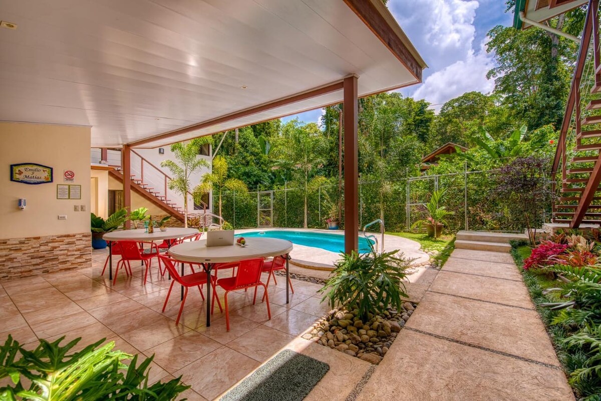 Hermoso complejo de 3 villas con piscina compartida a minutos del centro de Puerto Viejo. Villa 1: Cómodo alojamiento hasta para 4 pax ubicado en planta baja. Cuenta con 2 habitaciones con AC y cama queen. Además tienen una cocina totalmente equipada, baño completo con agua caliente, terraza externa y wifi y un espacio de salita con TV (con IPTV).