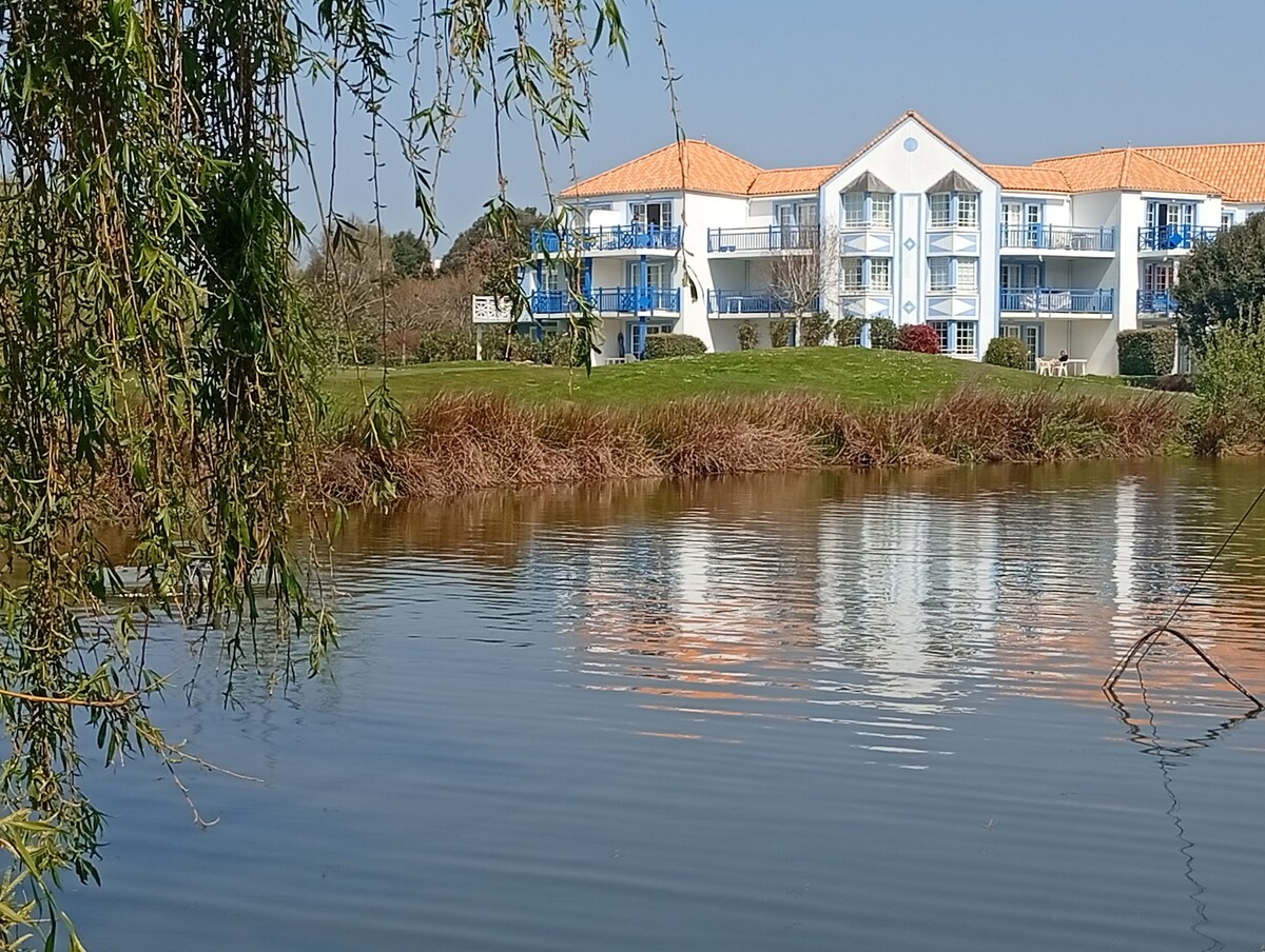 🌟Vous apprécierez sa magnifique vue sur le Lac et jardin, sa proximité de la plage du Veillon et du golf.🌟 Appart lumineux , chambre séparée avec 1 grand lit, WIFI, situé au 1er étage avec balcon et terrasse. 🌊💫ACCÈS gratuit piscine centrale avec bracelet L'espace aquatique du village (avec les toboggans) sera ouvert aux résidents et vacanciers Fin Avril au 12 sept. - 🏖️Plage du Veillon 1 km5 à pied p/chemin ou à vélo. - 🅿️Parking gratuit au pied de la rés. + parcs à vélos