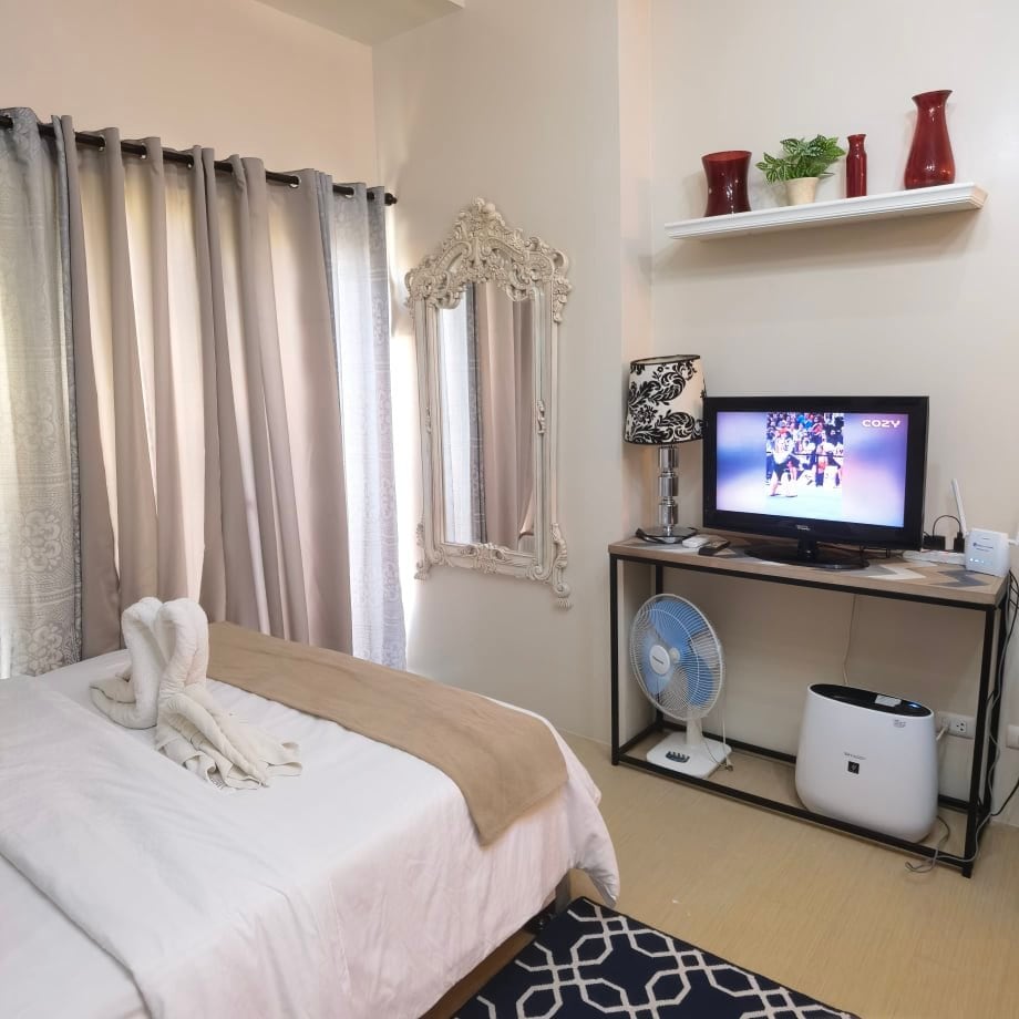 - Al otro lado del centro comercial SM City (cine, supermercado, grandes almacenes, cafeterías, Anytime Fitness). - 2 dormitorios con patios, vistas exuberantes. - 1 cama tamaño queen, 1 cama de matrimonio. - Hasta 1 colchón adicional disponible bajo petición (por favor, aviso previo). - Acceso gratuito a la piscina para 4 personas (200 pesos por persona adicional) (Aviso previo, por favor) (Piscina no disponible los lunes). - Aparcamiento de pago disponible (200 P/noche. Por favor, avisa con antelación). - Wifi de banda ancha. - Cocina -Lavadora - Registro autónomo. - Check in: 3:00 pm. - Salida: 11:00 a. m.