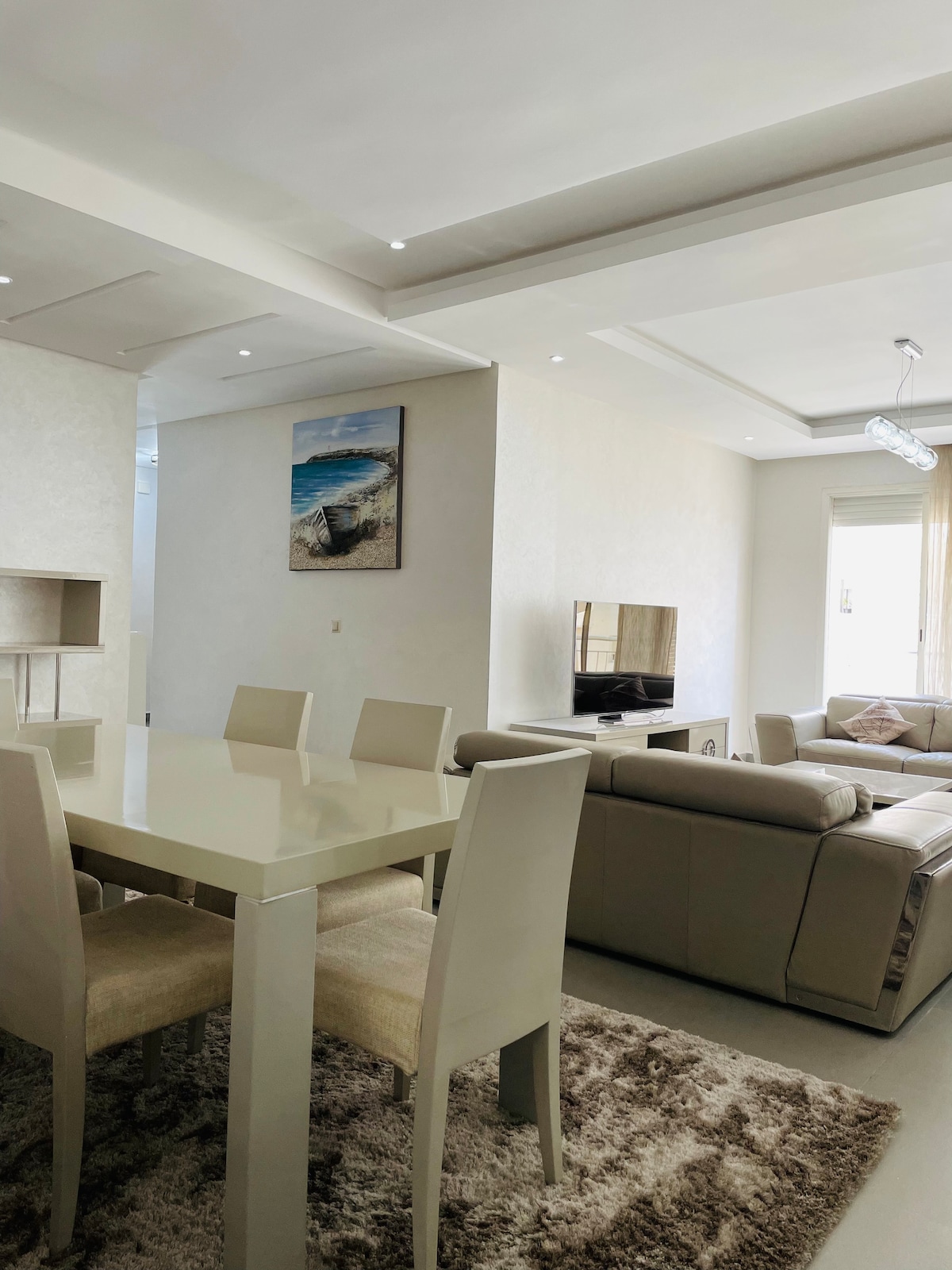 apartamento de alto categoría en el lugar más popular de Agadir que encontrará cerca, cafés restaurantes, playa, spa y hamam. el apartamento es ideal para 4 personas pero puede alojar hasta 6 personas El apartamento está equipado con un televisor led curvo, canales vía satélite (TF1, M6, canal Beinsport), wifi, 1 piscina grande en el edificio, aparcamiento gratuito y porteros las 24 horas