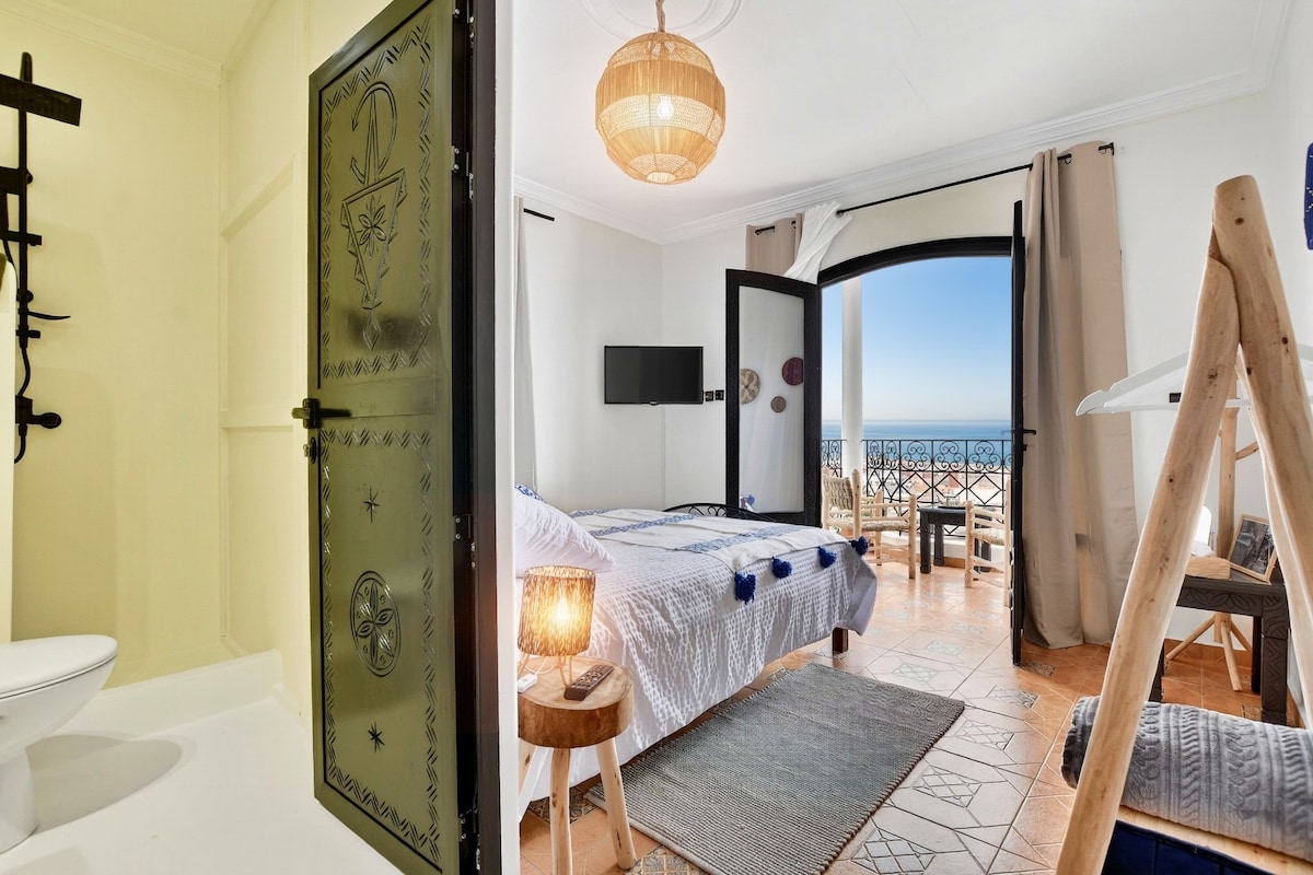 Découvrez le charme authentique de notre suite berbère, un espace ouvert conçu pour votre confort et votre détente. Elle comprend : • Un lit double pour des nuits paisibles, • Toilettes et douche privées pour votre intimité, • Une petite cuisine avec kitchenette • Un coin détente pour savourer un thé ou un café . Le tout agrémenté d’une vue spectaculaire sur la mer, parfaite pour des moments de relaxation et des souvenirs . Laissez-vous séduire par l’ambiance magique de cette suite berbère