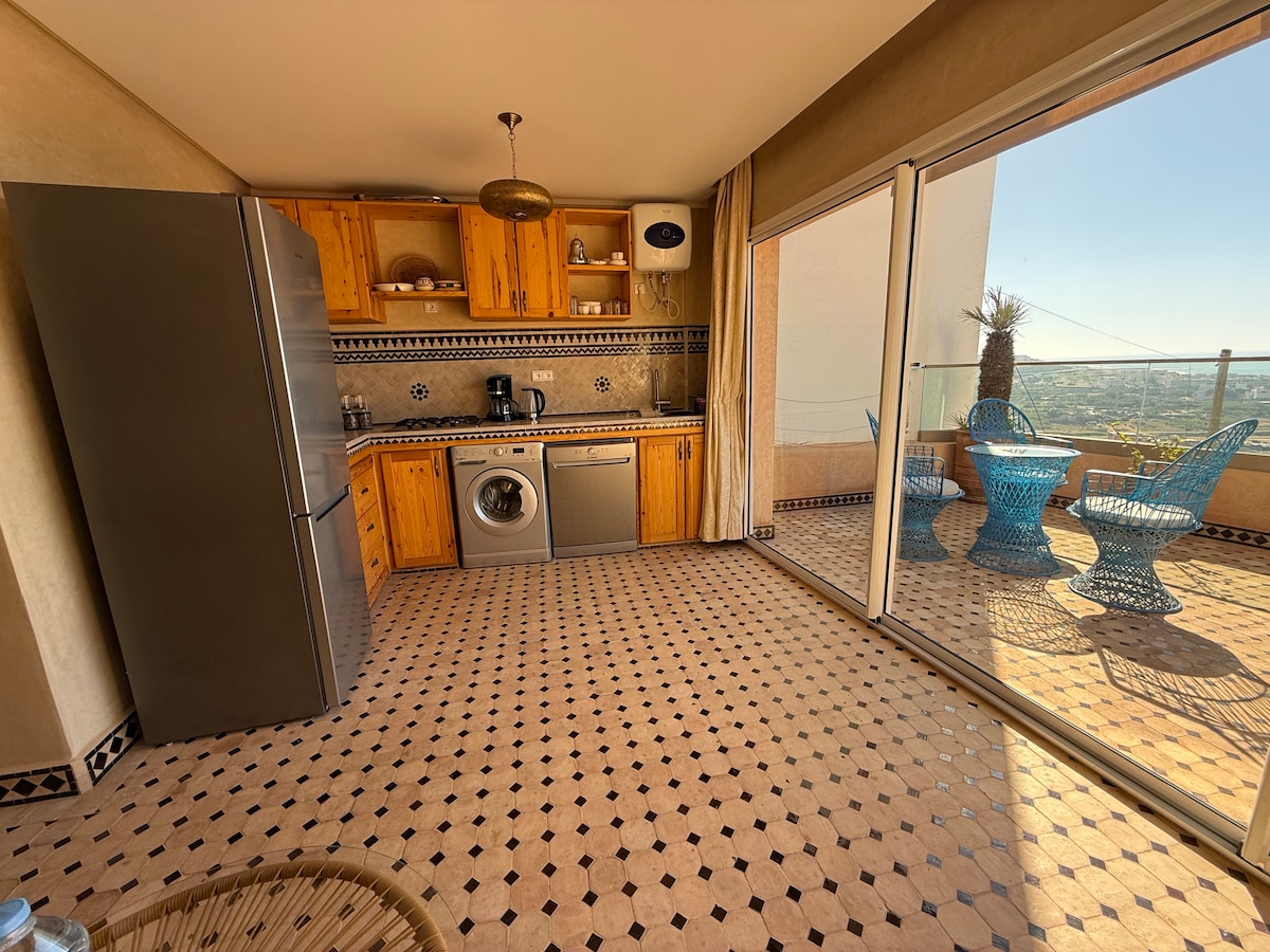 Magnifique appartement à Tamraght – Confort, espace et proximité de la plage Découvrez ce superbe appartement spacieux situé à Tamraght, à seulement 450m de la plage, situé dans une résidence sécurisée avec piscine. Il comprend 2 chambres, une salle de bain, des toilettes séparées, un grand salon, une salle à manger, une grande cuisine, 2 terrasses et un grand jardin privatif. Parking privé gratuit et fibre optique, idéal pour le télétravail. 📍tamraght / agadir