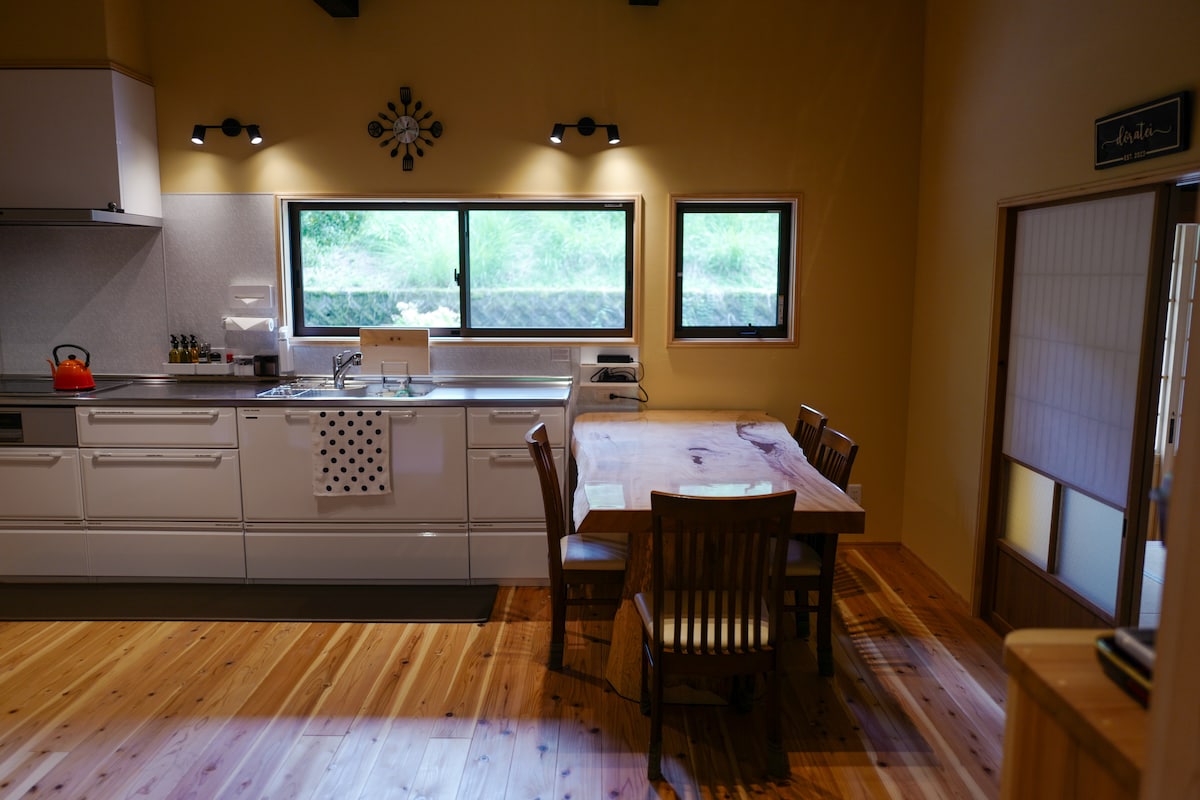 Doratei is a private riverside home in Ryujinmura, just a minute’s walk from the crystal-clear Hidakagawa River.. Designed for quiet, restorative stays in nature, and an ideal base for exploring the Kii Peninsula by car — within reach of Koyasan (1 hr), Shirahama (1 hr), Kumano Hongu Taisha (1.5 hrs), and Nachi Falls (2 hrs). The house blends modern comfort with traditional tatami rooms, a handmade copper sink, and a deep soaking bath — everything you need to slow down and stay a while.