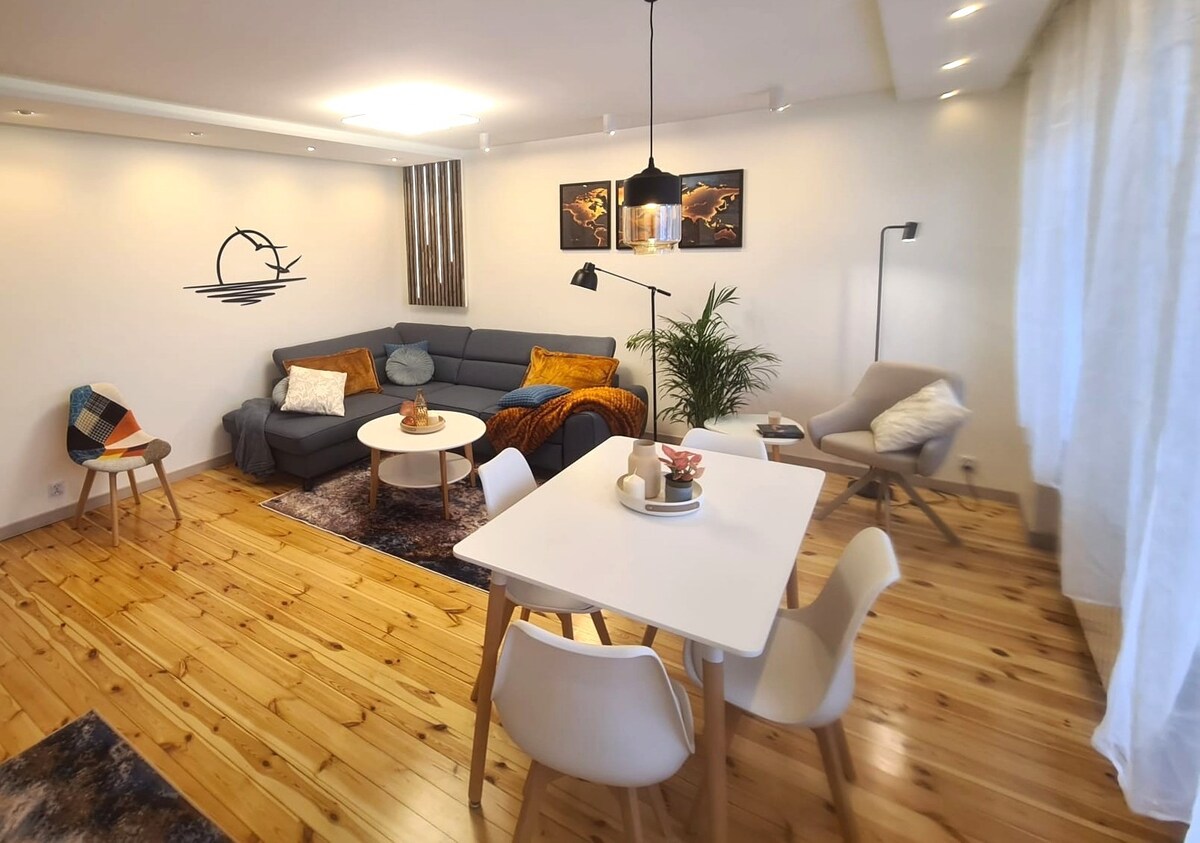 Idealny dla rodzin, par i osób podróżujących służbowo. Stylowy i przestronny apartament dla max 6 osób z 2 sypialniami, salonem i w pełni wyposażoną kuchnią. Wnętrze urządzone w nowoczesnym stylu z przytulnym oświetleniem – idealne na każdy pobyt. Do dyspozycji gości: komfortowy salon z TV, wyposażona kuchnia, łazienka z prysznicem, oddzielne WC, balkon oraz szybkie Wi-Fi. Świetne miejsce dla rodzin, grup znajomych i osób podróżujących służbowo, które szukają wygodnego i stylowego noclegu.