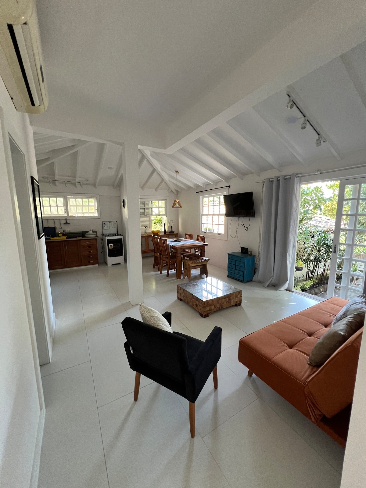 1 Loft frente mar, 100m2 vista absoluta. Por do sol na frente da casa. Casa simples, muito charmosa bucólica Buzios Roots Não tem garagem mas é possível estacionar na rua sem saída em frente a casa, muito segura com câmeras de segurança externas. Sala e quarto integrados. 1 Cama casal Queen e 1 sofá cama com 2 camas de solteiro A casa é para no máximo 4 pessoas, todos dormem no mesmo ambiente. 1 banheiro e 1 mini closet. Cozinha completa sem micro-ondas. Churrasqueira móvel no jardim