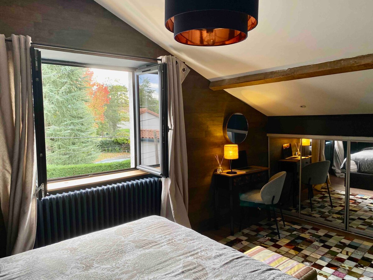 Un encantador refugio de paz te espera en esta espaciosa suite en la planta superior dentro de una casa de pueblo, situada en el corazón de Ecully y cerca del acceso a la autopista a Lyon. Disfrutarás de una suite principal independiente de 28 metros cuadrados en el segundo piso, completa con baño privado. La lujosa cama tamaño king de 180 cm, la misma que en el Cour des Loges de Lyon, un hotel de 5 estrellas. Sí, en efecto :-). Tanto si estás aquí por placer como por negocios, te sentirás renovado por una noche de sueño tranquilo y reparador.