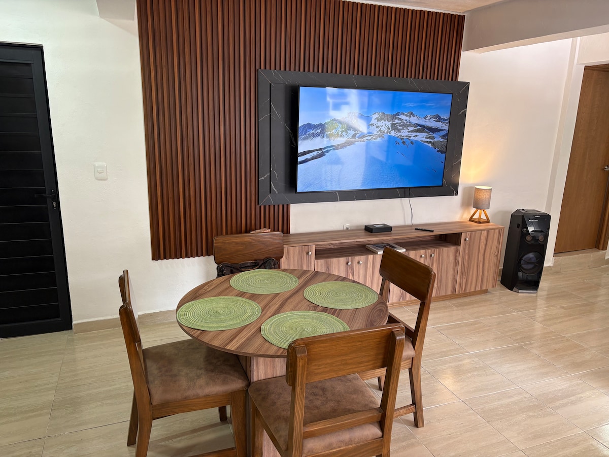 Es un departamento que cuenta con todos los servicios básicos como es cocina, sala, comedor, cuenta con un refrigerador, una estufa, utensilios de cocina, platos y cubiertos. Son dos recamaras y en cada una de ella se encuentra una cama de tamaño matrimonial. Cuenta el departamento con un baño completo. Hay una SmarTV de tamaño medio, asi mismo hay una red común de wifi. Al huésped se le brinda un cajón de estacionamiento privado dentro del inmueble.