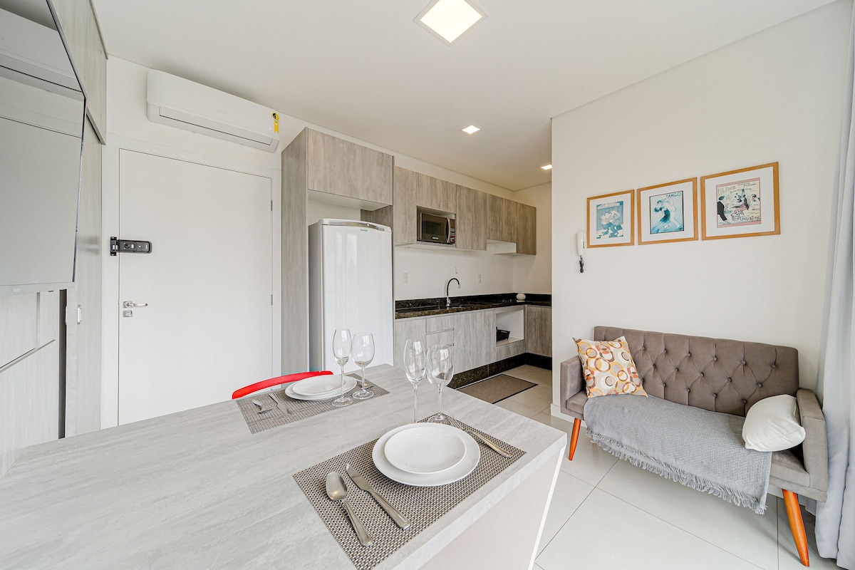 En Saguaçu, el mejor barrio de Joinville, 402 Studio H es un loft con muy buen gusto y espacio. Toda la comodidad para descansar o trabajar. Cocina completa, aire acondicionado, wifi y accesorios de higiene. Estacionamiento gratuito. Supermercado de autoservicio las 24 horas en el vestíbulo del edificio y lavandería de autoservicio OMO - Pago y uso a través de la aplicación. Hermosa piscina y gimnasio en la azotea. Ubicación cerca de todo, con mercado, panaderías, restaurantes, farmacia y fácil acceso al Centro, Teatro Bolshoi, Centreventos.