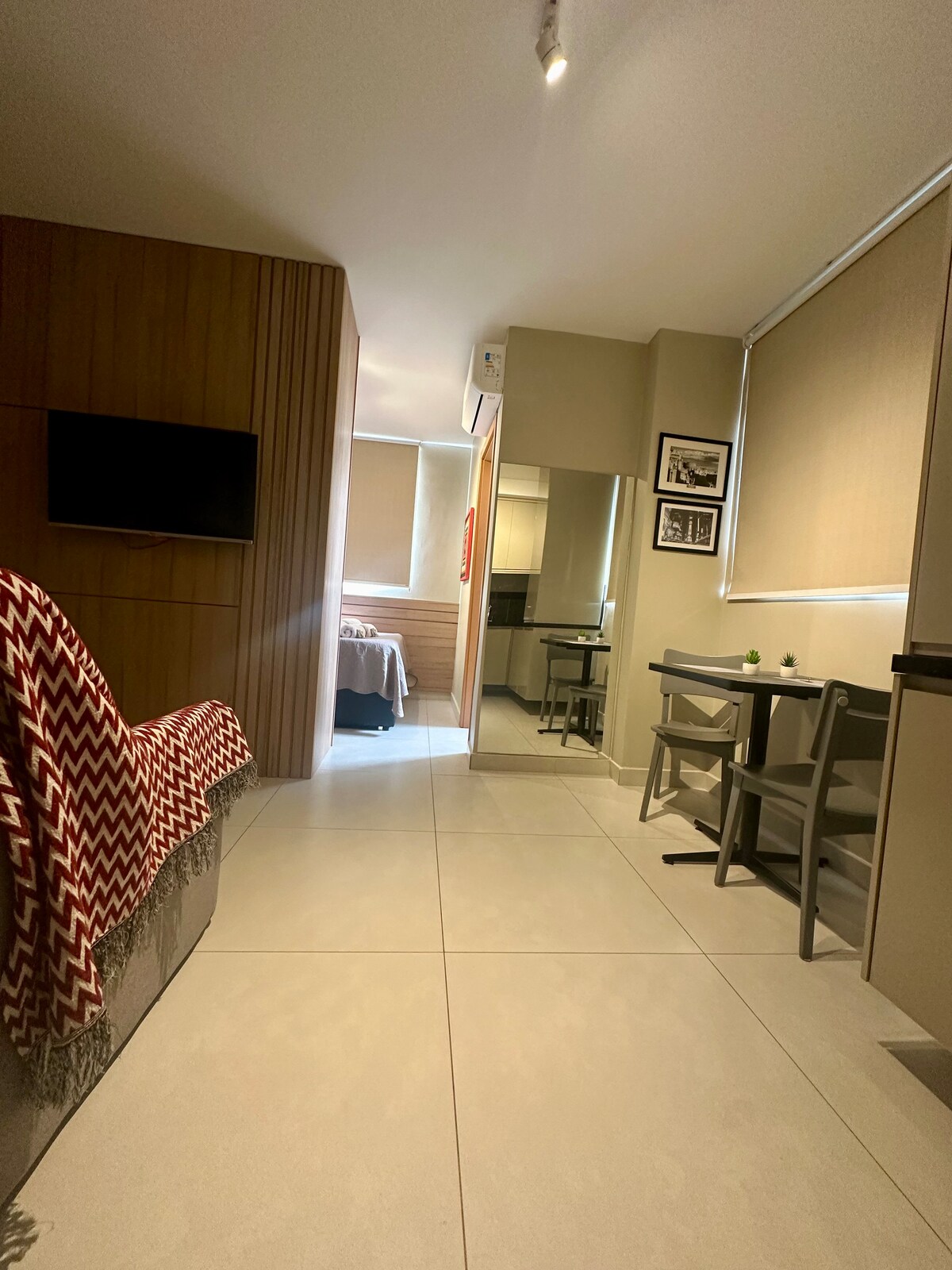 Hospede-se em um espaço central, totalmente equipado, com área de serviço e vaga de garagem. O prédio oferece piscina, espaço de coworking e academia, além de portaria virtual 24h e acessibilidade. O apê conta com: Cozinha completa, equipada com eletrodomésticos e utensílios; Quarto aconchegante com cama confortável e sofá-cama na sala; Marcenaria planejada, com armários e diversas comodidades que garantem praticidade e bem-estar. Perfeito para quem busca conforto e uma excelente localização!