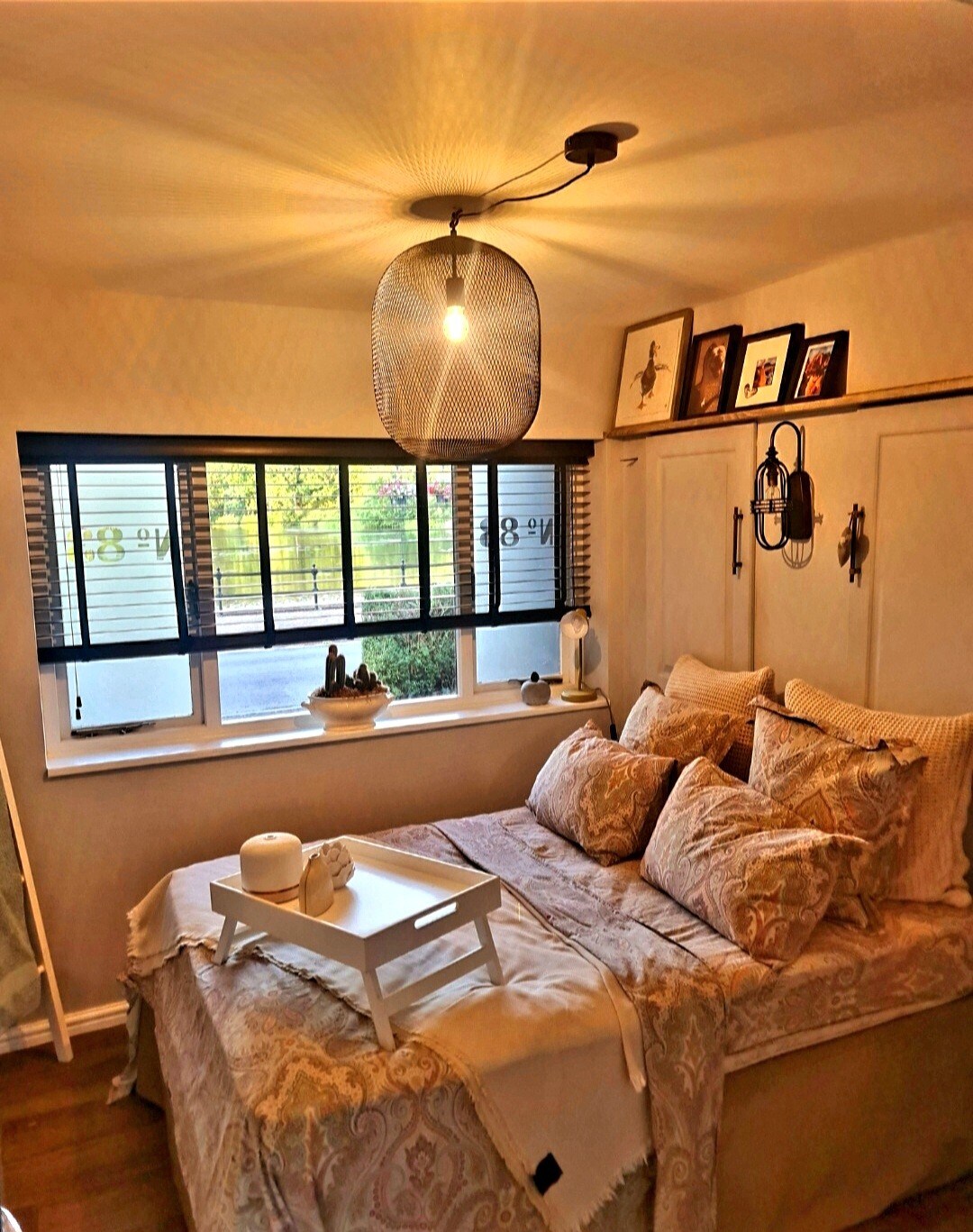 Un dormitorio separado con cama tamaño king, además de un cómodo sofá cama doble dentro de la sala de estar/cocina. Baño separado con ducha potente. Las puertas del patio conducen desde la cocina y el dormitorio a la terraza con vistas al lago. Área de patio totalmente cerrada con mesa y sillas de madera maciza, una barbacoa de carbón y chimenea. Uso de ** jacuzzi de leña (costo adicional £ 79 por 2 nt/fin de semana) iluminación Festoon ¡20 acres de lago, arroyos, bosques y campos para disfrutar de todo lo que la naturaleza tiene para ofrecer!