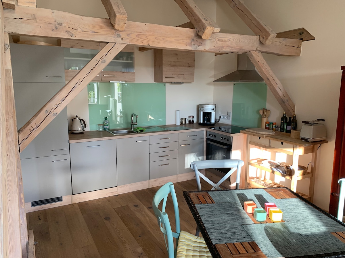 El Kranichhof "Atelier" es uno de los tres hermosos apartamentos de vacaciones en una antigua granja reformada y ampliada en el centro histórico de Wünsdorf. El "Atelier" se encuentra en el primer planta, tiene una gran terraza con vistas al suroeste sobre jardines, prados y huertos en la reserva natural y paisajística. La antigua estructura del tejado se ha incluido en el diseño abierto del apartamento. Parquet de roble, triple acristalamiento, estufa de leña, cocina abierta empotrada. ¡No se admiten mascotas!
