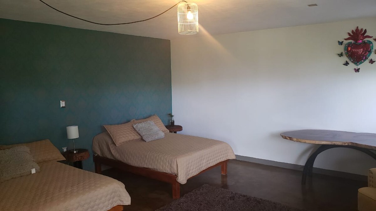 Cómoda y pintoresca habitación con una cama queen size y una cama individual tipo litera, con baño privado, ducha y tina de hidromasaje, patio y jardín compartidos, desayuno incluido (café o te, fruta, jugo y un platillo a elegir) y decorado con finos toques tradicionales mexicanos. TV de pantalla plana, cable, cafetera, microondas, mini refrigerador, caja de seguridad, wi-fi gratuito, secador de cabello, plancha y tabla de planchar, colchones muy cómodos, toallas y finas amenidades de baño.