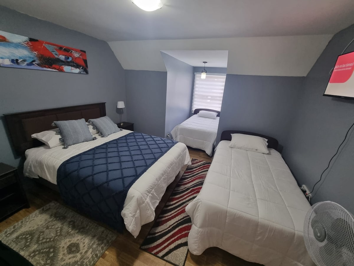 Alojamiento en sector centro de Temuco, con estacionamiento y sanitización diaria. La habitación es con baño compartido para el grupo y para una habitación más, cuenta además con otro baño en primer piso. El baño es de cabina, fuera de la habitación, contamos con toallas. Habitación para tres personas, está en un segundo piso. Cuenta con comedor en el primer piso, está ubicado en zona residencial de Temuco, sector centro, a cuadras de bancos, centros comerciales y notarías.