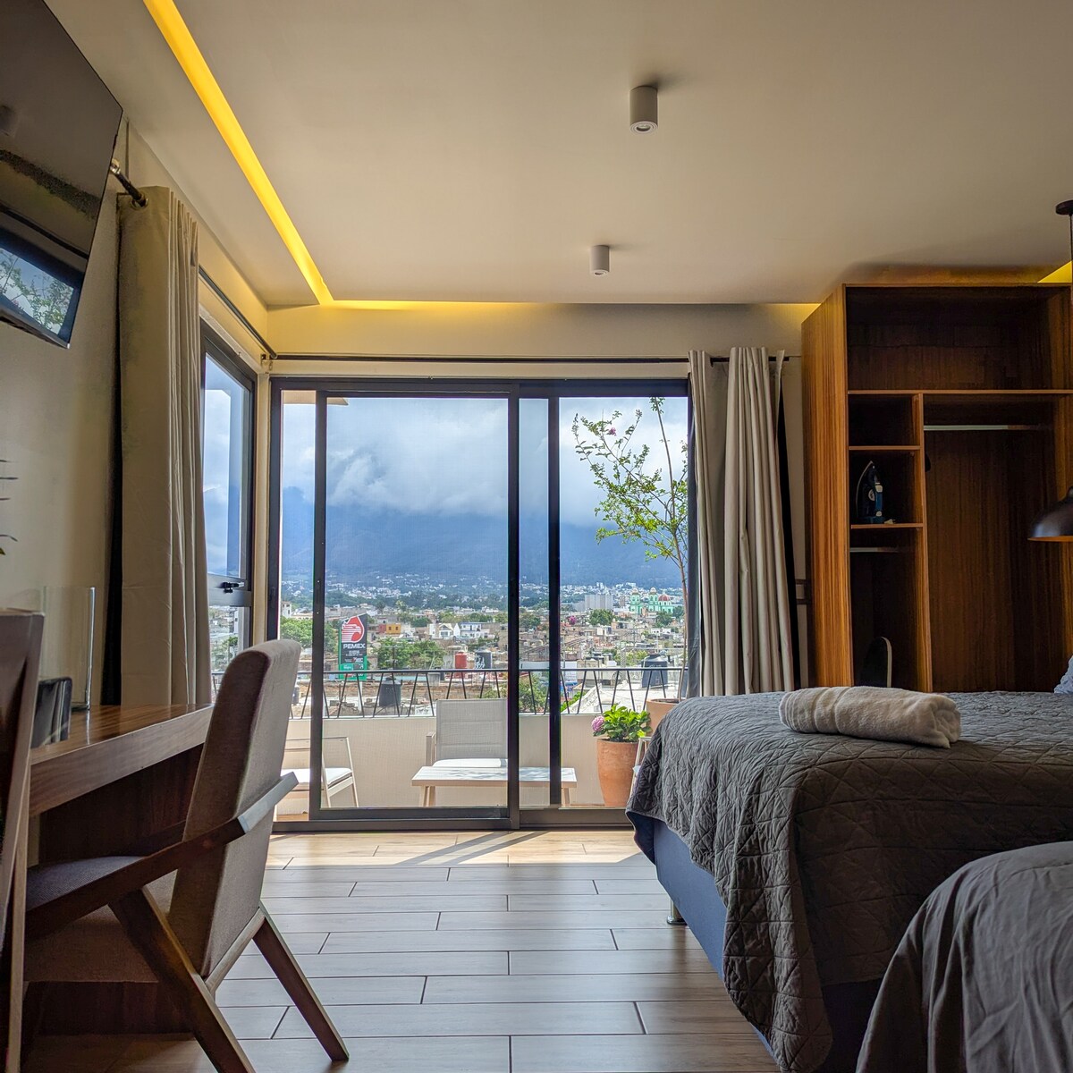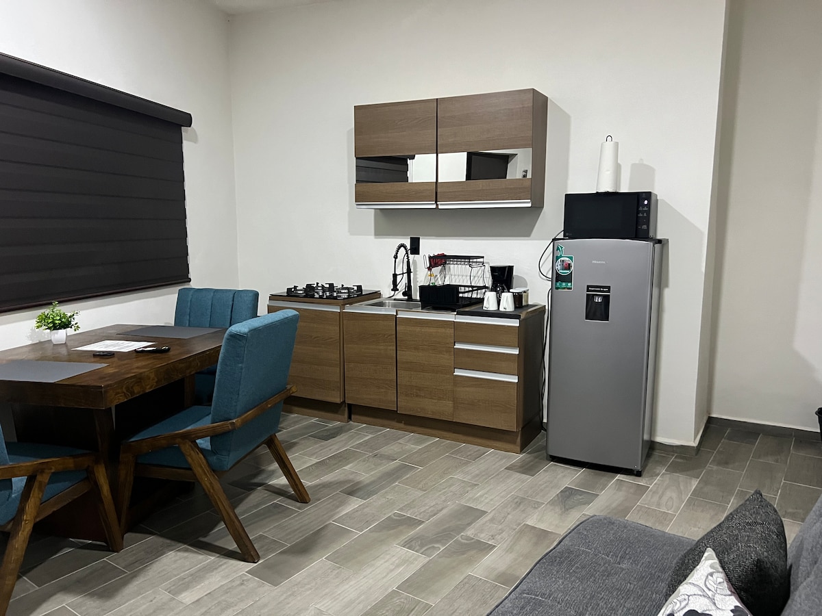 Disfruta de un espacio cómodo y completamente nuevo, ideal para estancias cortas o largas. Este acogedor estudio cuenta con una cama king size, TV, baño completo y una cocineta equipada para que prepares tus platillos favoritos. Además, relájate en su pequeña terraza privada con vista a la ciudad. Perfecto para viajeros, parejas o quienes buscan comodidad y cercanía a los principales atractivos de Tepic. ¡Reserva ahora y vive una experiencia única!