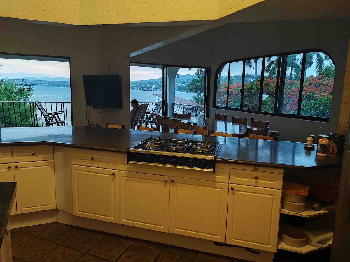 Hermosa casa de 2 plantas, con una altura privilegiada en su terreno que con sus amplios ventanales brinda vistas incomparables del lago de Tequesquitengo. Garage para 4 autos. Casa con alberca , climatizada,rodeada de jardines, zona de asador, cuenta con bocina con bluetooth. Television con Sky y Netflix así como Wifi en toda las areas. A pie de lago encontraras un Club de Playa casi frente a nosotros, donde podrás rentar deportes acuáticos. Jardines de Mexico a 10 min.
